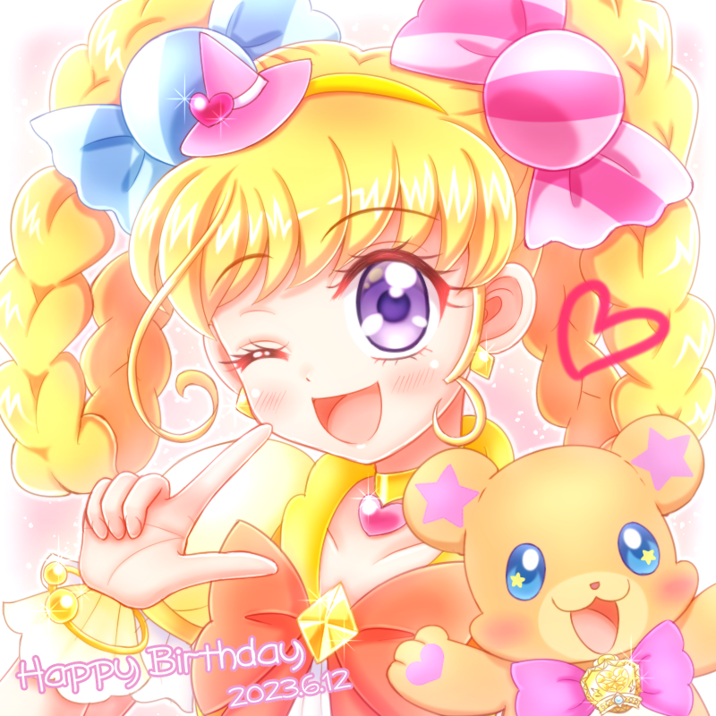 1girl asahina_mirai blonde_hair blue_bow blue_eyes blush bow bowtie braid braided_hair_rings brooch cure_miracle cure_miracle_(topaz_style) dated dress earrings fairy hair_bow hair_rings happy_birthday hat jewelry long_hair magical_girl mahou_girls_precure! mofurun_(precure) necklace niwatori_(syamo_chamo) one_eye_closed open_mouth pink_bow pink_bowtie pink_hat precure puffy_short_sleeves puffy_sleeves purple_eyes red_bow red_bowtie short_sleeves smile solo star-shaped_pupils star_(symbol) stuffed_animal stuffed_toy symbol-shaped_pupils teddy_bear twin_braids upper_body witch_hat wrist_cuffs yellow_dress