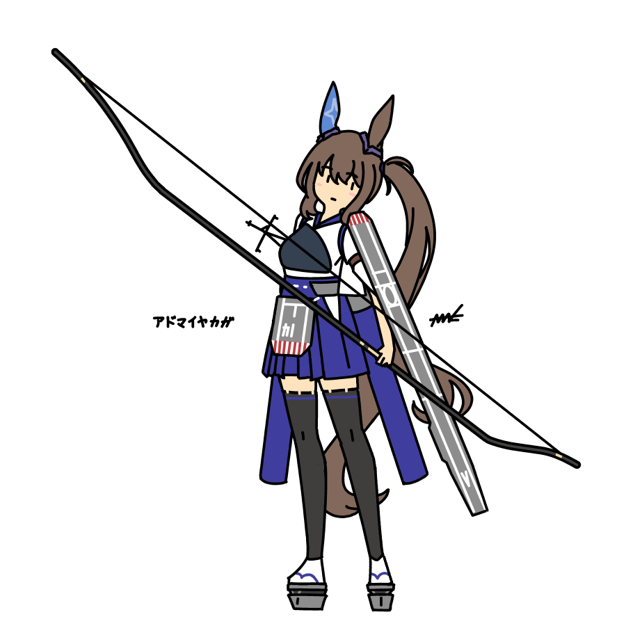 1girl admire_vega_(umamusume) animal_ears apron black_thighhighs blue_hakama bow_(weapon) brown_hair cosplay ear_covers flight_deck geta hakama hakama_skirt horse_ears horse_girl horse_tail japanese_clothes kaga_(kancolle) kaga_(kancolle)_(cosplay) kaga_kai_ni_(kancolle) kaga_kai_ni_(kancolle)_(cosplay) kantai_collection kashinoki_(koaaski) muneate platform_footwear platform_sandals sandals signature simple_background single_ear_cover skirt solo standing tail thighhighs umamusume weapon white_background