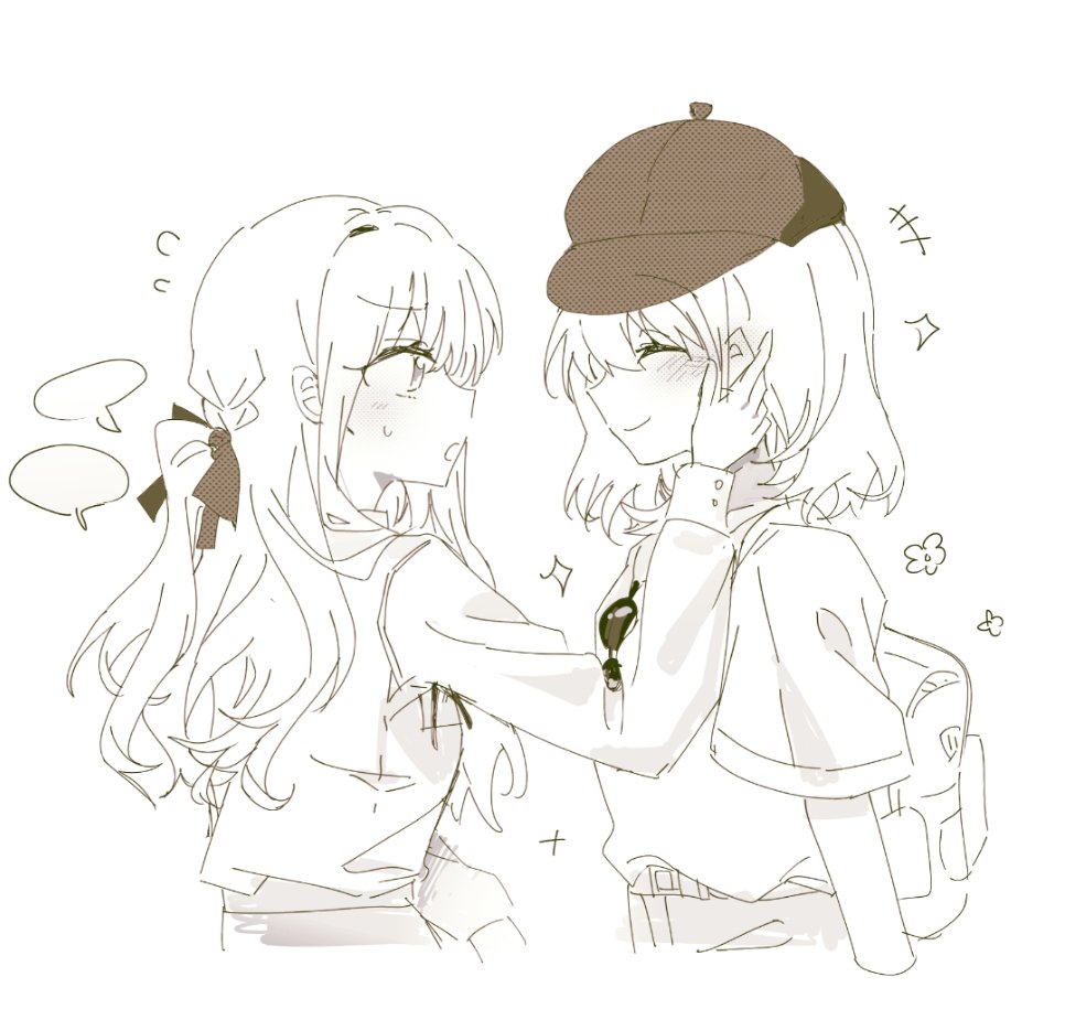 2girls bang_dream! bang_dream!_it's_mygo!!!!! blush chinese_commentary closed_mouth commentary_request hair_ribbon hand_on_another's_cheek hand_on_another's_face long_hair long_sleeves misumi_uika multiple_girls okamo_(oakm071) open_mouth ribbon short_sleeves sidelocks sparkle sweatdrop togawa_sakiko two_side_up yuri