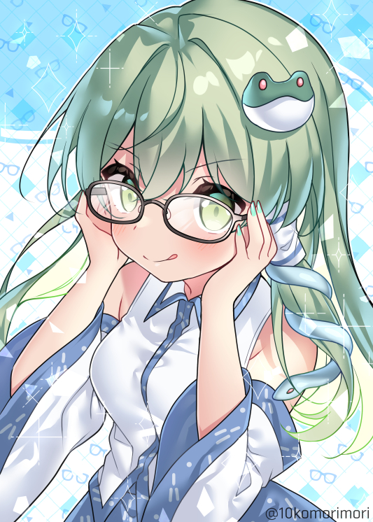 1girl bare_shoulders bespectacled blue_skirt breasts closed_mouth collared_shirt detached_sleeves frog_hair_ornament glasses green_eyes green_hair hair_intakes hair_ornament hair_tubes juugou_taki kochiya_sanae light_blush long_hair long_sleeves looking_at_viewer medium_breasts patterned_clothing print_skirt shirt signature single_hair_tube single_sidelock skirt skirt_set sleeveless sleeveless_shirt snake_hair_ornament solo sparkle tongue touhou twitter_username upper_body wide_sleeves wing_collar