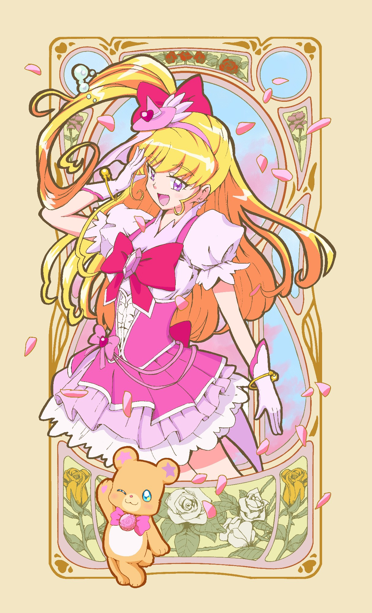 1girl asahina_mirai blonde_hair blue_eyes blush bow bowtie brooch closed_mouth cure_miracle dress earrings fairy gloves hair_bow hairband hat high_side_ponytail highres jewelry kagekaku long_hair magical_girl mahou_girls_precure! mahou_girls_precure!!_mirai_days mofurun_(precure) one_eye_closed one_side_up open_mouth pink_bow pink_bowtie pink_dress pink_gloves pink_hairband pink_hat precure puffy_short_sleeves puffy_sleeves purple_eyes short_sleeves side_ponytail smile solo star-shaped_pupils star_(symbol) stuffed_animal stuffed_toy symbol-shaped_pupils teddy_bear underbust witch_hat