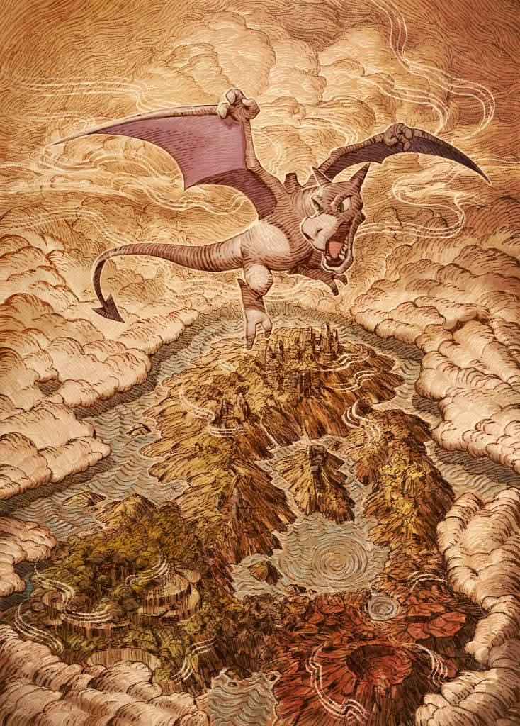 1other aerodactyl cloud colored_skin danciao dinosaur fangs flying gen_1_pokemon green_eyes grey_skin horns island monster nintendo no_humans ocean official_art open_mouth pokemon pokemon_tcg pokemon_tcg_pocket solo tail volcano wings