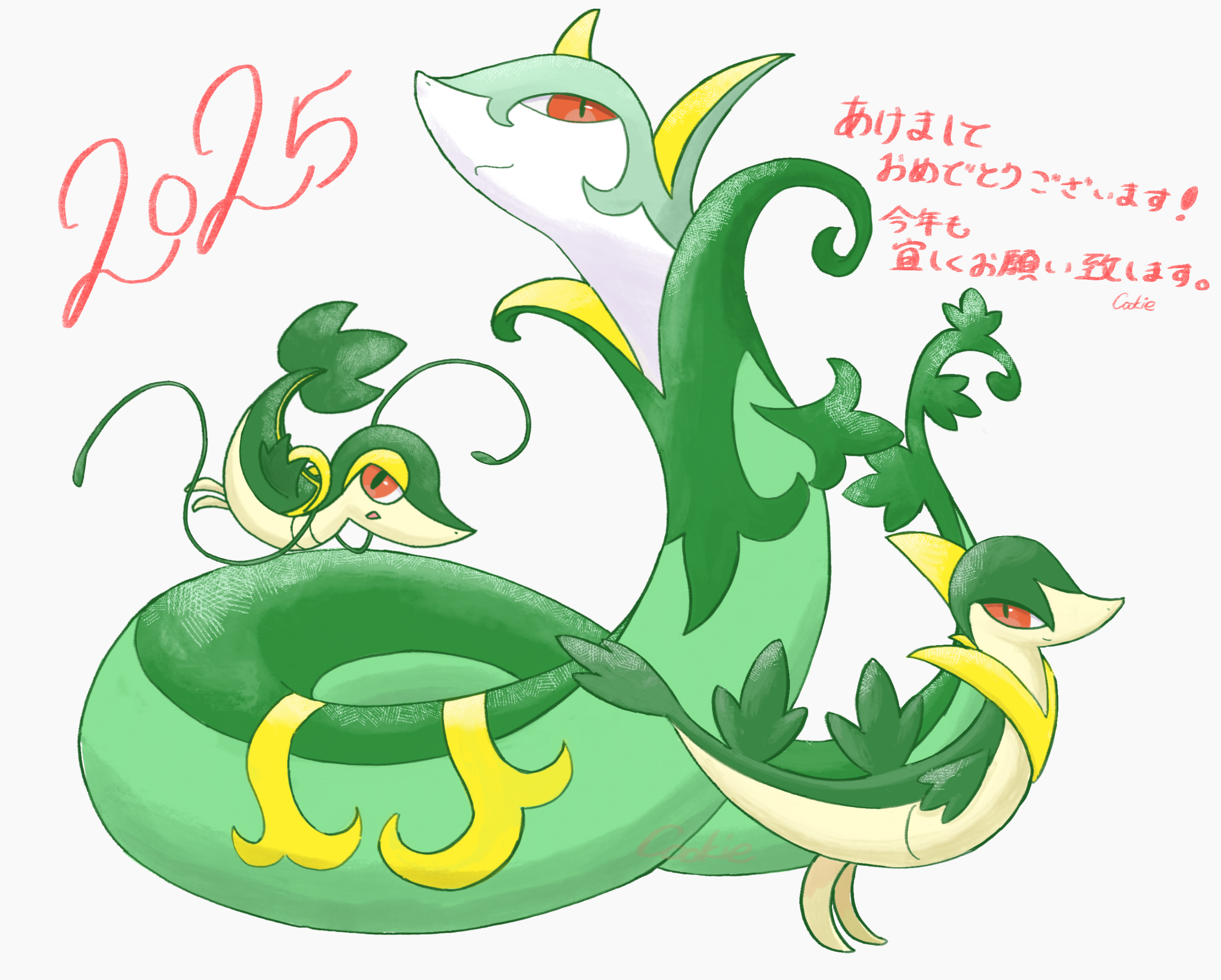 2025 chinese_zodiac closed_mouth evolutionary_line gen_5_pokemon highres nintendo no_humans open_mouth plant pokemon pokemon_(creature) red_eyes serperior servine simple_background smile snivy vines year_of_the_snake