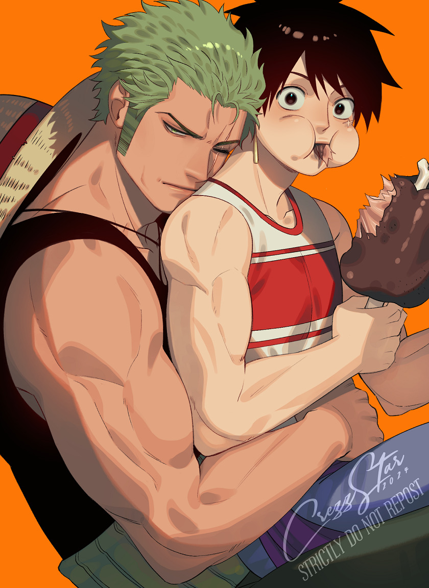2boys biceps black_eyes black_hair black_tank_top boned_meat chewing couple crezz_(infj_crezz) dark-skinned_male dark_skin earrings eating facial_scar food food_in_mouth green_eyes green_hair hat hat_on_back head_on_another's_back jewelry looking_at_viewer male_focus meat monkey_d._luffy multiple_boys muscular muscular_male one_eye_closed one_piece orange_background puffy_cheeks roronoa_zoro scar scar_across_eye scar_on_cheek scar_on_face short_hair sideburns simple_background single_earring sitting sitting_on_lap sitting_on_person straw_hat tank_top toned toned_male upper_body yaoi