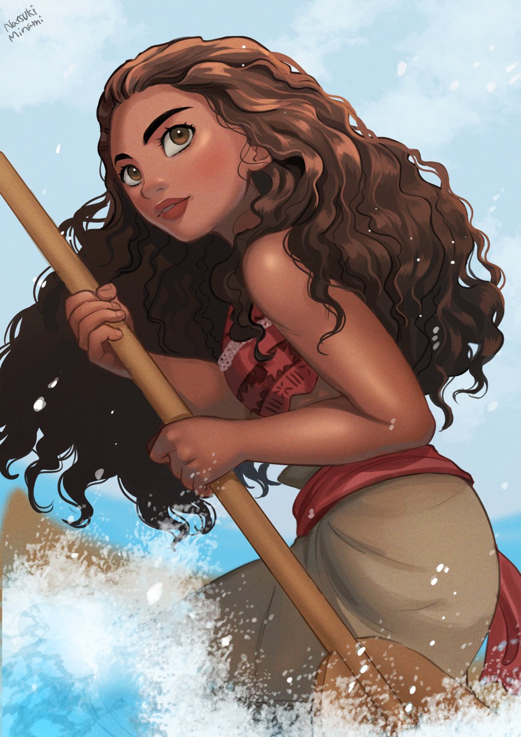 1girl bare_shoulders breasts brown_eyes brown_hair curly_hair dark-skinned_female dark_skin flower hair_ornament highres holding jewelry long_hair looking_at_viewer midriff moana_(movie) moana_waialiki natsuki_nori necklace simple_background solo strapless upper_body water