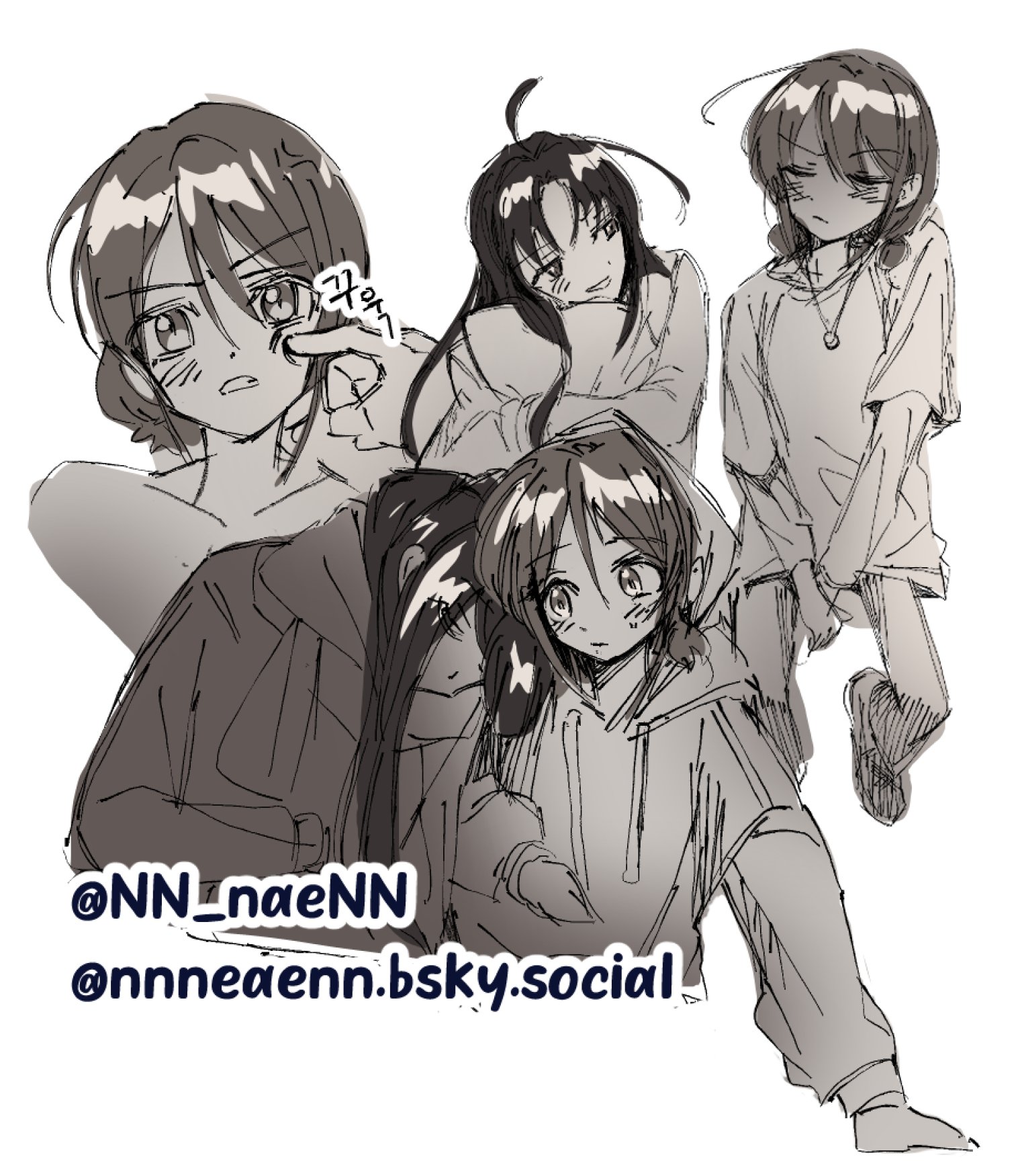 2girls ahoge awa_subaru bluesky_username blush cheek_poking commentary_request girls_band_cry greyscale highres hood hoodie iseri_nina korean_commentary long_hair long_sleeves low_twintails monochrome multiple_girls multiple_views nn_naenn parted_bangs poking short_hair short_twintails simple_background twintails twitter_username white_background yuri