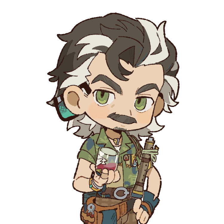 1boy alcohol belt belt_pouch black_gloves black_hair bracelet brown_belt brown_pants chibi collared_shirt cup drinking_glass facial_hair fingerless_gloves flute gloves green_eyes green_shirt hand_on_own_hip holding holding_cup instrument jewelry looking_at_viewer male_focus mature_male mr._duncan_(reverse:1999) multicolored_hair mustache official_art old old_man pants pouch reverse:1999 shirt short_hair short_sleeves single_glove solo streaked_hair thick_eyebrows upper_body white_background white_hair wine