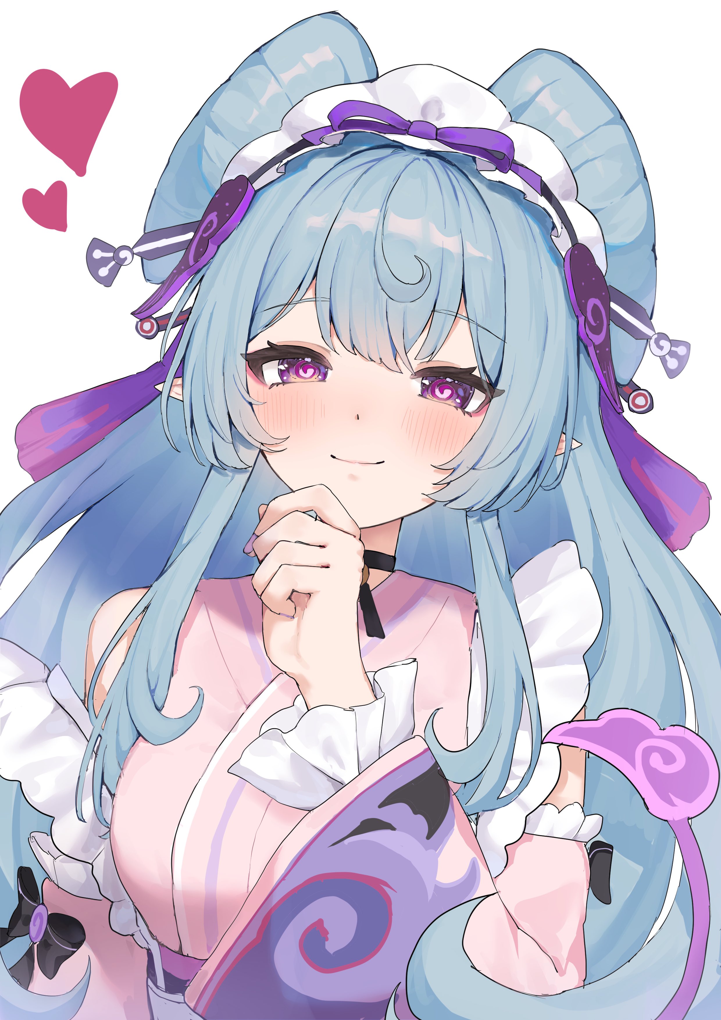 1girl absurdres black_choker blue_hair blush choker closed_mouth detached_sleeves frilled_hairband frilled_sleeves frills genshin_impact hairband hand_on_own_chin heart highres japanese_clothes kimono long_hair long_sleeves nihongami pink_kimono pointy_ears purple_eyes ririru simple_background sleeveless sleeveless_kimono smile solo tail tapir_tail upper_body white_background white_hairband yumemizuki_mizuki