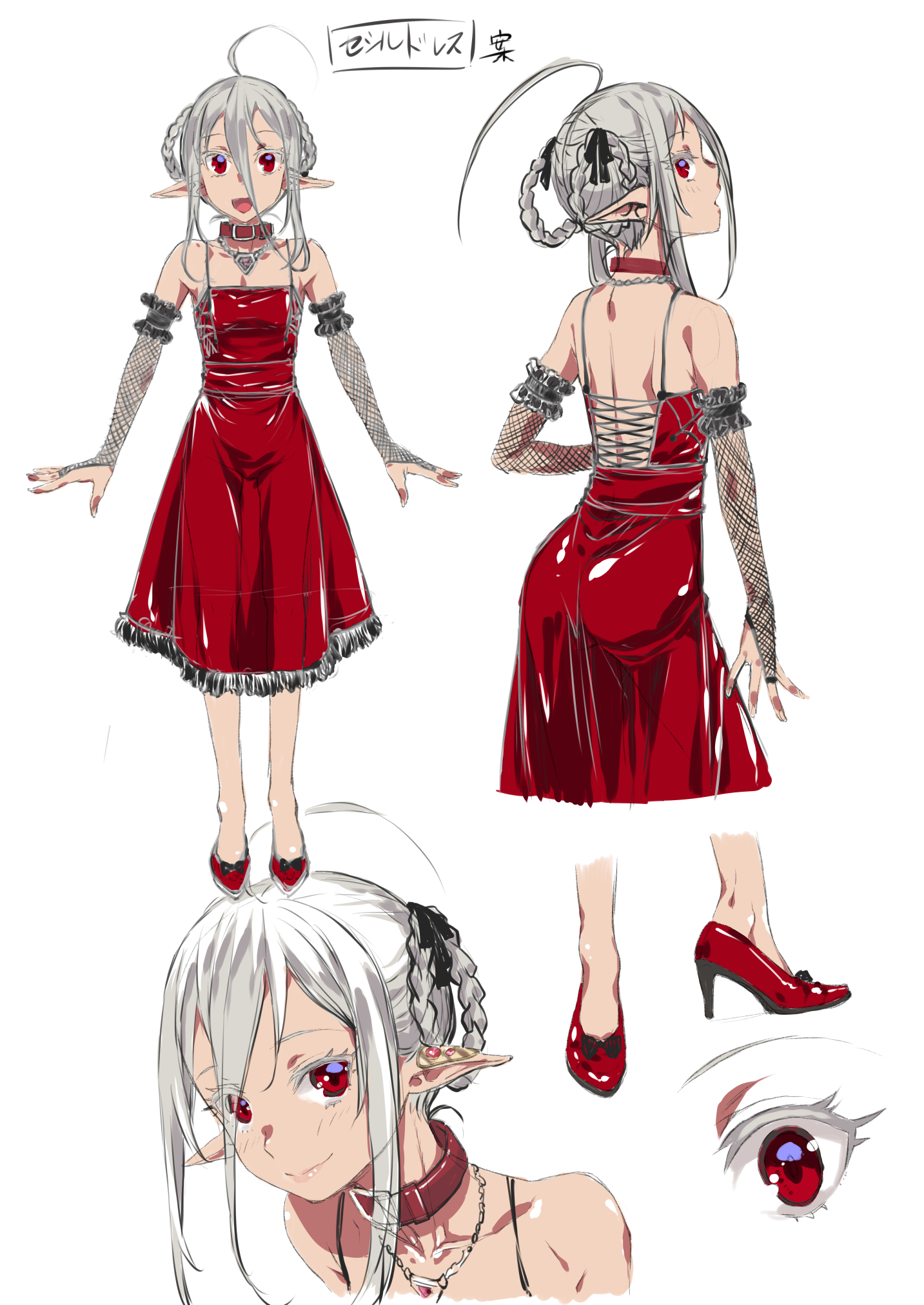 1girl ahoge bare_shoulders braid braided_hair_rings breasts bridal_gauntlets character_request choker commentary_request concept_art copyright_request dress fishnet_gloves fishnets full_body gloves grey_hair hair_rings high_heels highres jewelry katase_minami multiple_views necklace pointy_ears red_dress red_eyes red_footwear sidelocks small_breasts smile