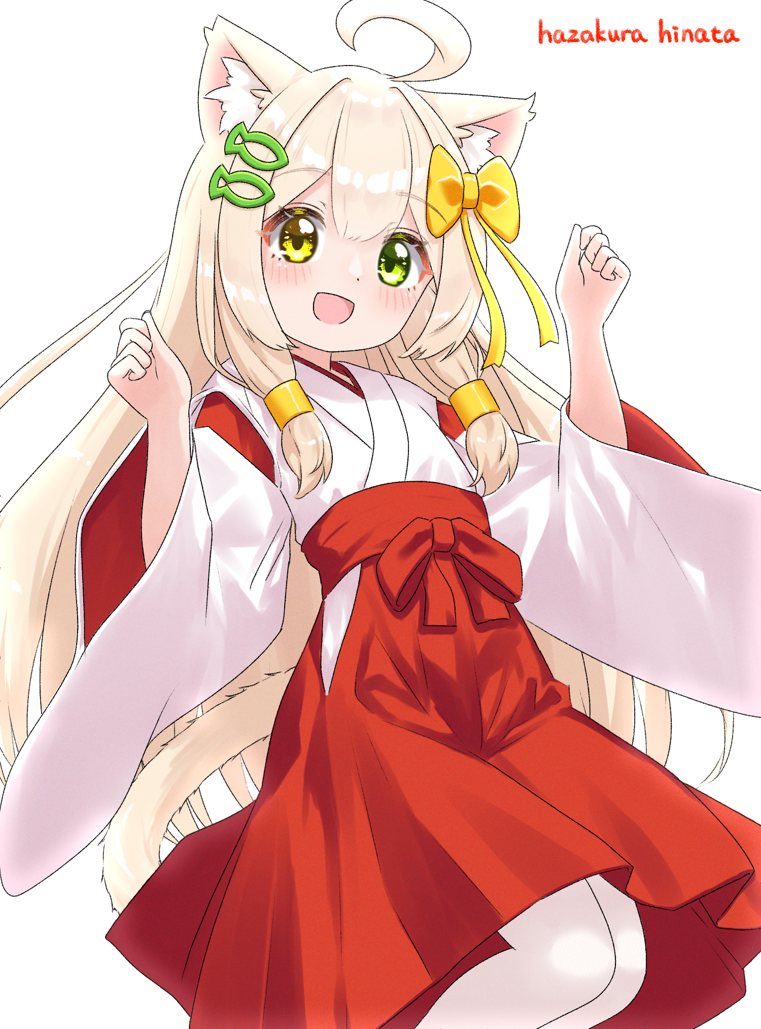 1girl :d animal_ear_fluff animal_ears artist_name blonde_hair bow cat_ears cat_girl cat_tail commentary_request fish_hair_ornament green_eyes hair_bow hair_ornament hakama hakama_skirt hands_up hazakura_hinata heterochromia highres japanese_clothes kimono kurumi_(hazakura_hinata) long_hair long_sleeves looking_at_viewer miko open_mouth original pantyhose red_skirt simple_background skirt smile solo tail very_long_hair white_background white_kimono white_pantyhose wide_sleeves yellow_bow yellow_eyes