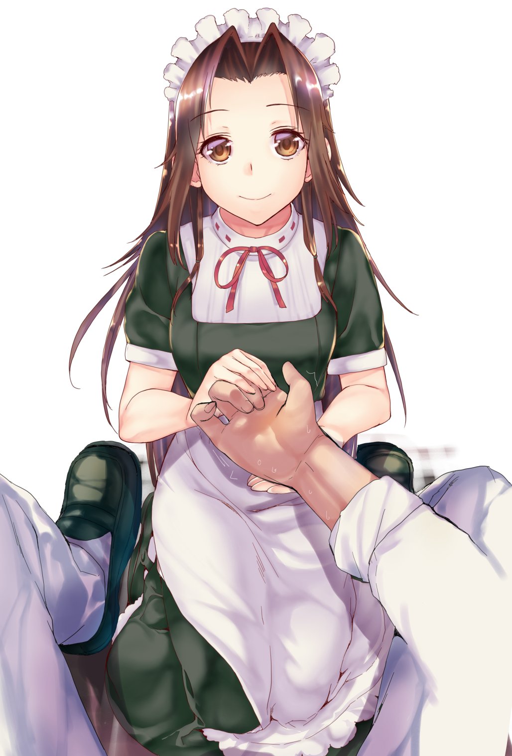 1boy 1girl admiral_(kancolle) apron brown_eyes brown_hair commentary_request dress green_dress highres holding_hands jintsuu_(kancolle) kantai_collection katase_minami kneeling long_hair looking_at_viewer maid maid_headdress sitting smile solo_focus white_apron
