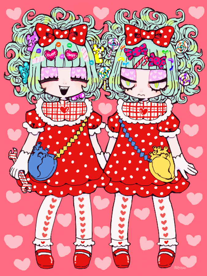 2girls a03bi9 aqua_eyes aqua_hair blue_bag bow candy candy_cane_hair_ornament closed_eyes closed_mouth commentary dress food food-themed_hair_ornament frilled_sleeves frills gloves gummy_bear_hair_ornament hair_bow hair_ornament heart heart-shaped_bag heart_background heart_hair_ornament heart_print holding holding_wrench jelly_bean lollipop_hair_ornament looking_at_another medium_hair messy_hair multiple_girls open_mouth original polka_dot polka_dot_bow polka_dot_dress purple_bow red_background red_bow red_dress red_footwear sharp_teeth short_sleeves siblings untranslatable_commentary teeth thighhighs twins upper_teeth_only wavy_mouth white_gloves white_thighhighs wrench yellow_bag