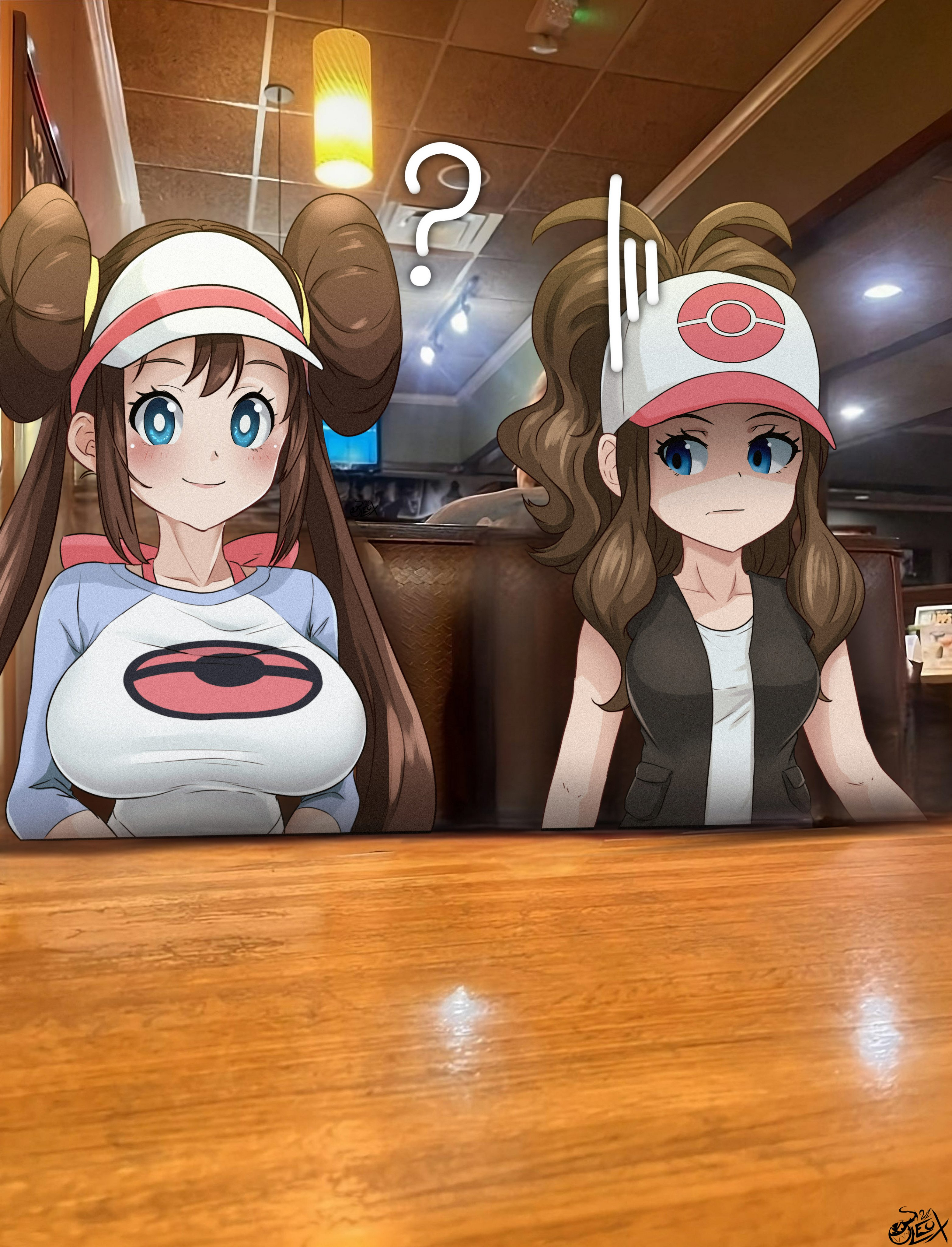 2girls ? absurdres baseball_cap black_vest blue_eyes blush booth_seating breast_envy breasts brown_hair closed_mouth commentary donut_hair_bun double_bun english_commentary expressionless facing_viewer hair_bun hat highres hilda_(pokemon) indoors jealous large_breasts leux21eraser long_hair long_sleeves looking_at_another multiple_girls nintendo photo_background pokemon pokemon_black_and_white pokemon_black_2_and_white_2 ponytail raglan_sleeves restaurant rosa_(pokemon) shirt sidelocks sideways_glance sitting small_breasts smile table twintails upper_body very_long_hair vest visor_cap white_shirt