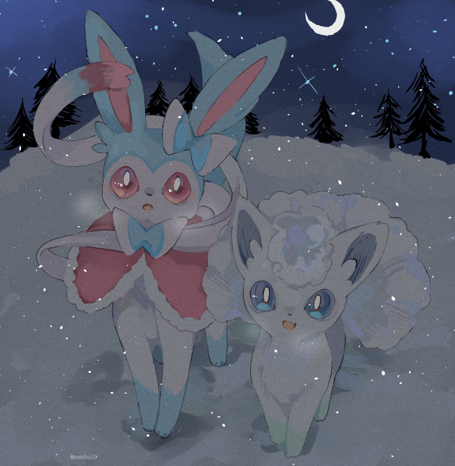 alolan_form alolan_vulpix alternate_color blue_eyes blue_fur breath bright_pupils cape cold creature creature_focus crescent_moon dark fang full_body fur-trimmed_cape fur_trim gen_6_pokemon gen_7_pokemon highres momohu33 moon night nintendo no_humans open_mouth outdoors parted_lips pink_eyes pokemon pokemon_(creature) red_cape shiny_pokemon skin_fang sky smile snow sparkle standing sylveon tree white_fur winter