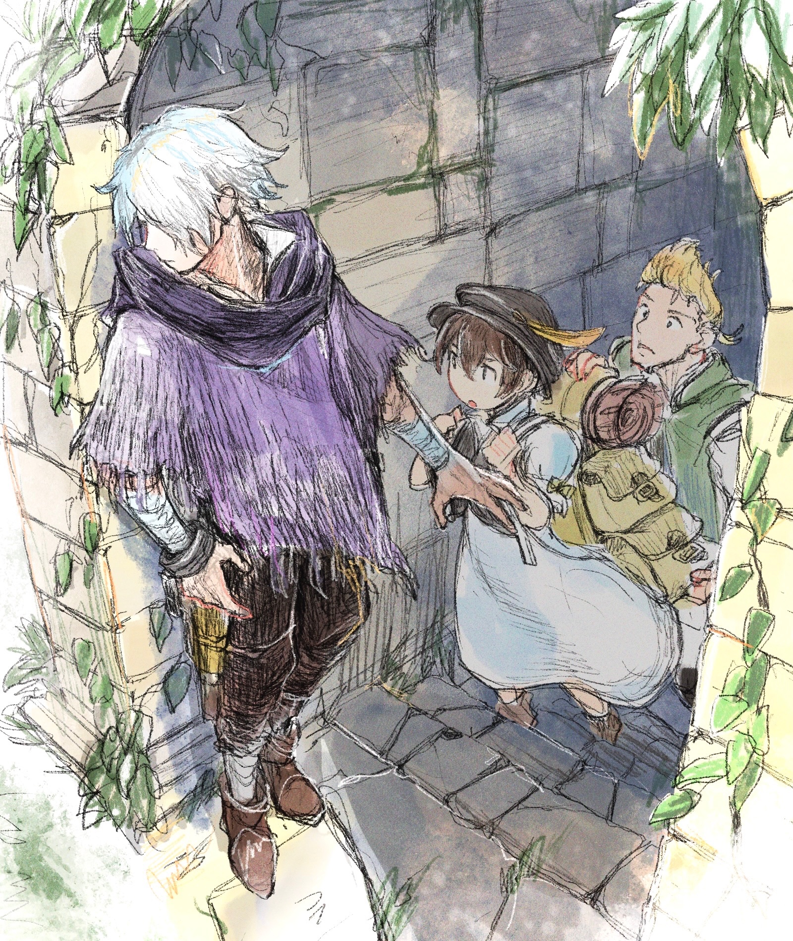 1girl 2boys alfyn_greengrass black_hat blonde_hair brown_hair cloak commentary_request dress hair_between_eyes hat highres multiple_boys octopath_traveler octopath_traveler_i open_mouth purple_cloak qqqqqli short_hair stairs standing therion_(octopath_traveler) tressa_(octopath_traveler) tressa_colzione white_dress white_hair