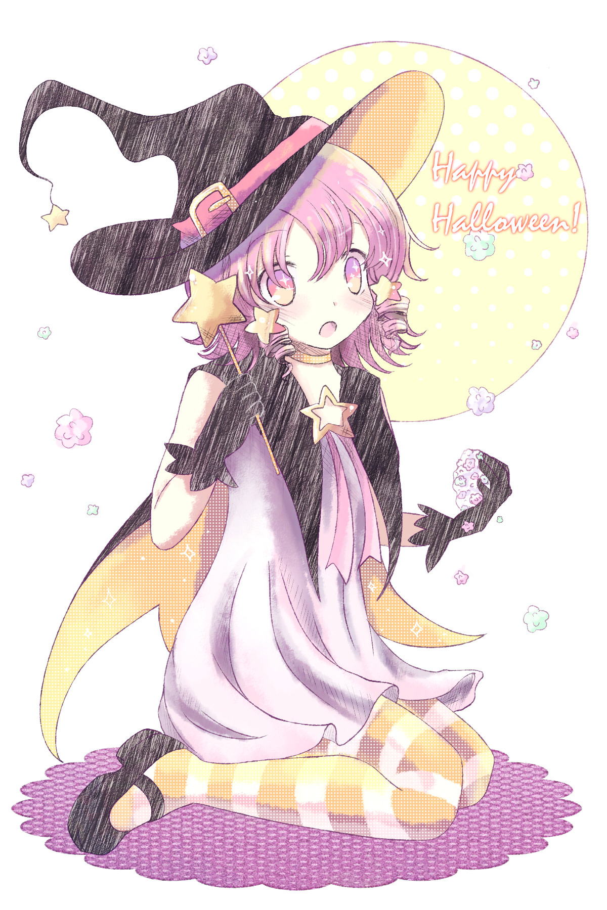 1girl aishin arcadea dress drill_hair drill_sidelocks hair_ornament hat highres holding holding_wand morinne_(arcadea) pink_eyes pink_hair short_hair sidelocks solo star_(symbol) star_hair_ornament star_wand striped_clothes striped_thighhighs thighhighs wand witch witch_hat