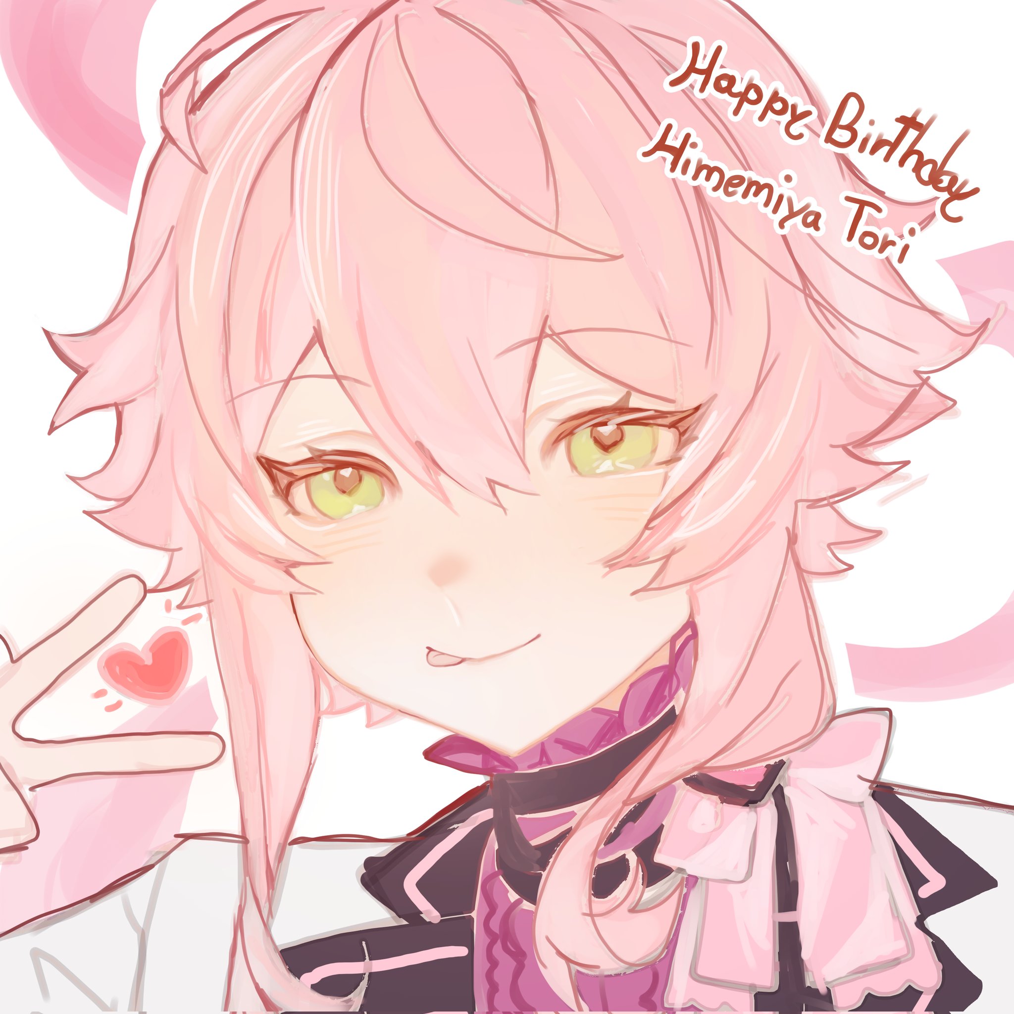 1boy androgynous black_jacket blazer blush bow character_name closed_mouth ensemble_stars! grey_jacket happy_birthday heart highres himemiya_tori jacket looking_at_viewer male_focus multicolored_jacket p_pholvee pink_background red_shirt shirt simple_background smile solo tongue tongue_out v