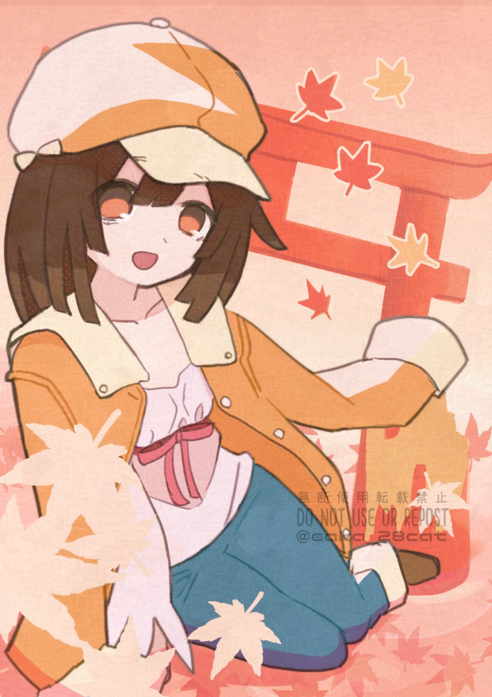 1girl arm_support bakemonogatari blue_pants breasts brown_footwear brown_hair cotton_1186 english_text falling_leaves full_body hair_between_eyes hat highres jacket jacket_on_shoulders leaf long_sleeves looking_at_viewer maple_leaf meek_nadeko monogatari_(series) newsboy_cap open_mouth orange_eyes orange_hat orange_jacket outdoors pants pink_shirt sengoku_nadeko shirt short_hair sitting small_breasts smile solo straight_hair torii twitter_username watermark yokozuwari
