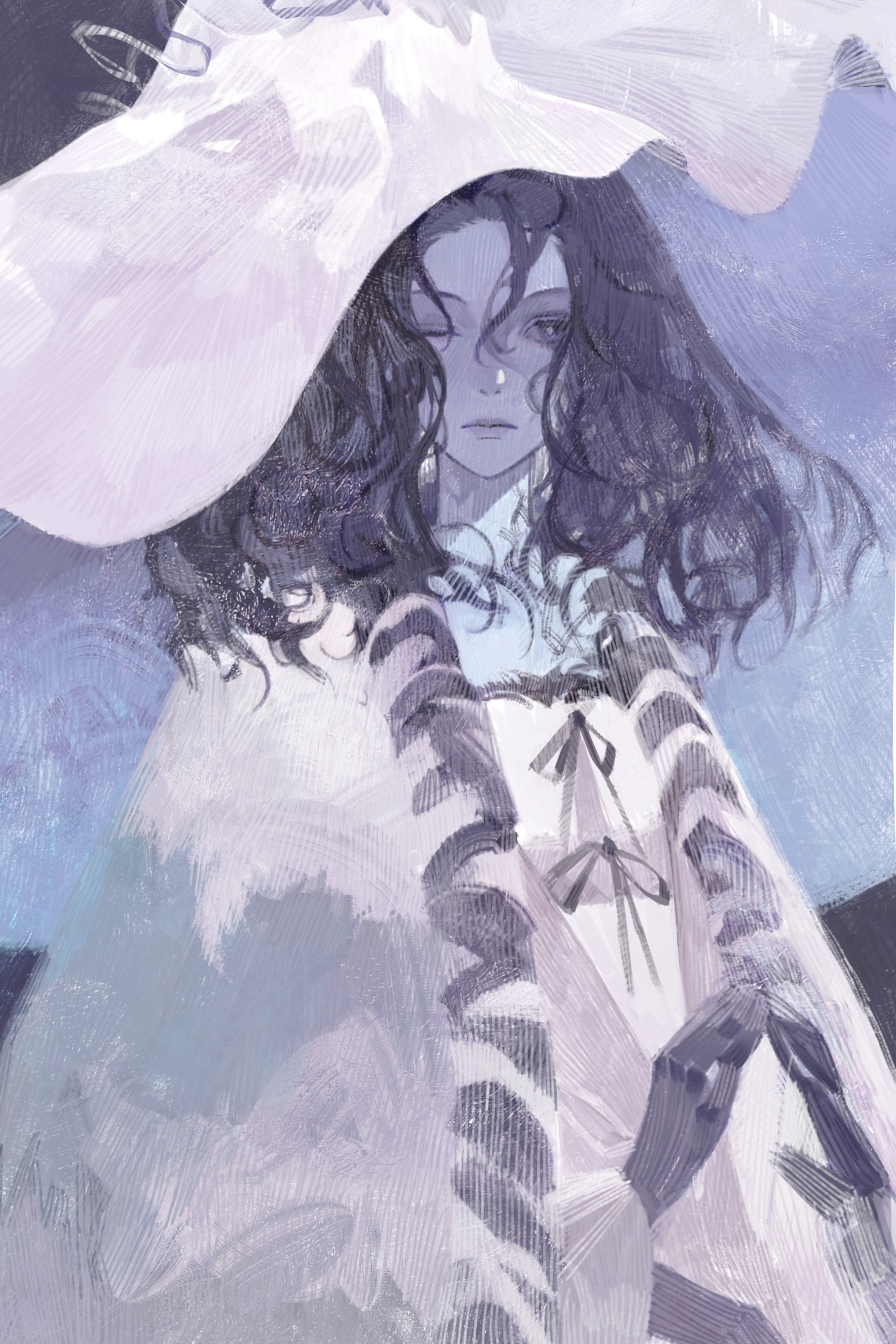 1girl absurdres beanetrrors black_hair blue_skin brush_stroke cape colored_skin curly_hair dress elden_ring faux_traditional_media hat highres large_hat lips looking_to_the_side one_eye_closed own_hands_clasped own_hands_together pale_skin ranni_the_witch solo upper_body white_cape white_dress white_hat
