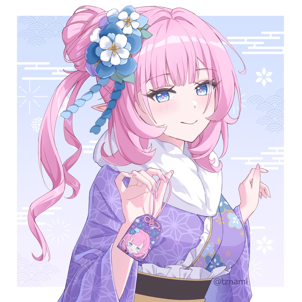 1girl alternate_costume artist_name blue_background blue_eyes border closed_mouth commentary egasumi elf elysia_(honkai_impact) english_commentary flower hair_bun hair_flower hair_ornament hands_up holding honkai_(series) honkai_impact_3rd japanese_clothes kimono long_hair nami_(tznami) new_year omamori outside_border pink_hair pink_pupils pointy_ears purple_kimono seigaiha smile solo upper_body white_border