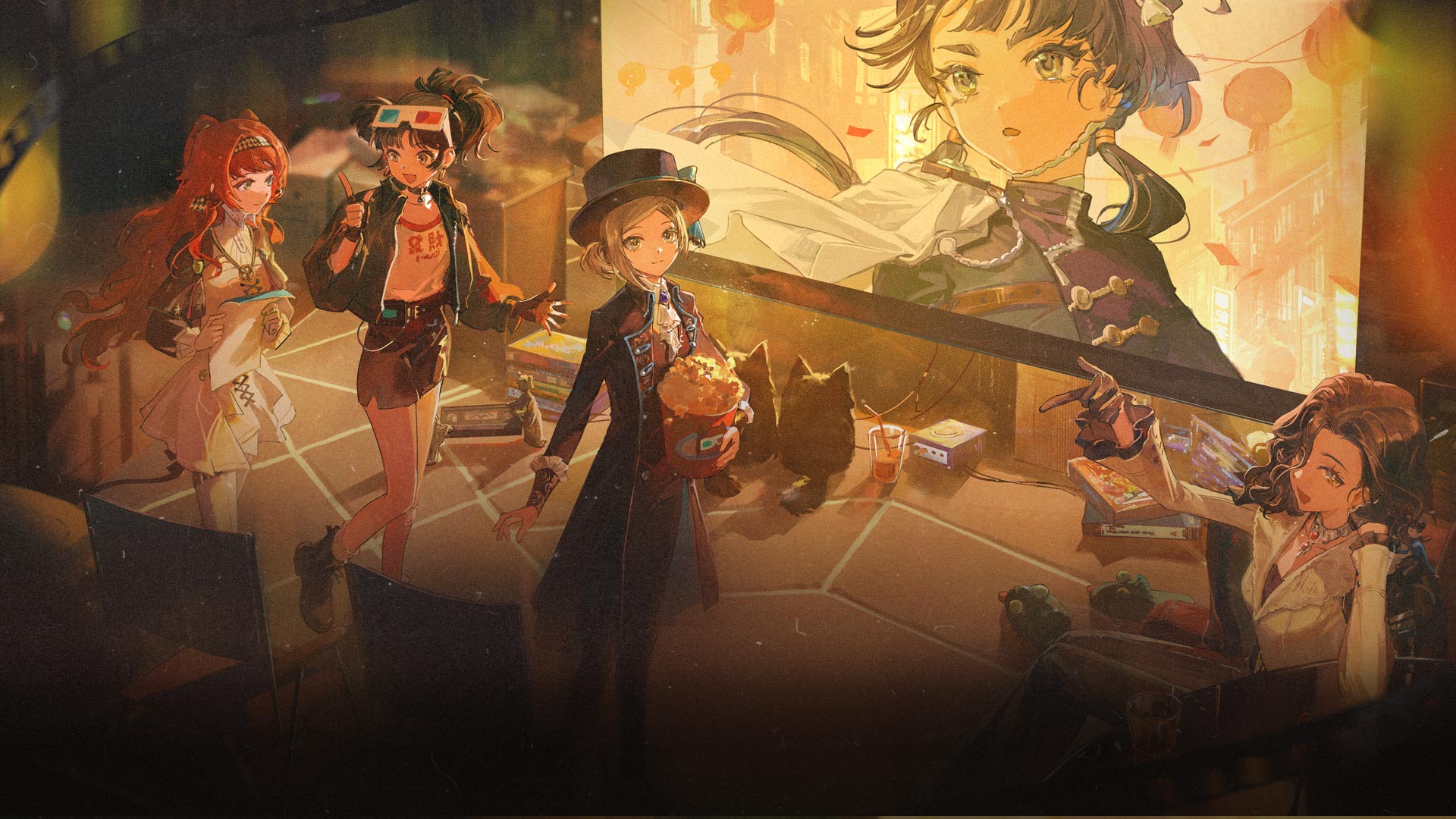 3d_glasses 3girls 4girls :d an-an_lee ankle_boots ascot bad_source black_coat black_footwear black_gloves black_hair black_hat black_pants black_skirt blue_bow boater_hat boots bow bucket carbuncle_(reverse:1999) checkered_hairband clothes_writing coat collared_dress collared_shirt creature cup dress drinking_glass drinking_straw eyewear_on_head facing_another feet_out_of_frame fingerless_gloves food gloves green_eyes green_jacket grey_eyes grey_hair grey_pants hair_bun hairband hand_up hat hat_bow high_collar highres holding holding_bucket holding_paper jacket liang_yue_(reverse:1999) long_hair looking_at_another looking_at_viewer looking_to_the_side miniskirt multiple_girls noire_(reverse:1999) official_art open_mouth orange_hair pants pants_under_dress paper pencil_skirt ponytail popcorn reverse:1999 shirt short_dress single_side_bun sitting skirt smile socks sonetto_(reverse:1999) tile_floor tiles two_side_up vertin_(reverse:1999) very_long_hair videocassette walking white_ascot white_dress white_gloves white_jacket white_pants white_shirt white_socks yellow_eyes