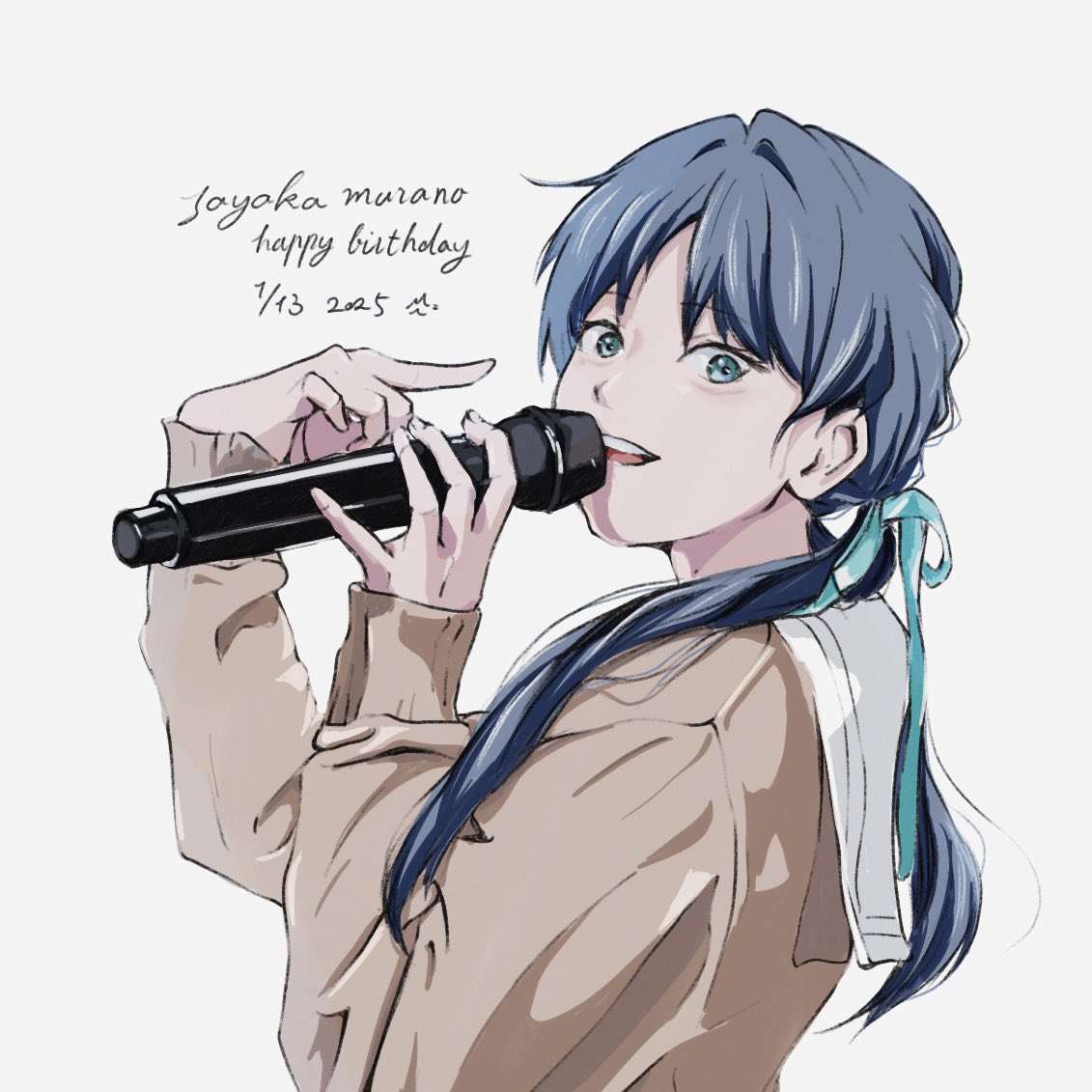 1girl :d arm_up blue_eyes blue_hair blue_ribbon brown_cardigan cardigan character_name commentary dated hair_intakes hair_ribbon hand_up happy_birthday hashtag-only_commentary hasu_no_sora_school_uniform holding holding_microphone link!_like!_love_live! long_hair long_sleeves love_live! low_twintails mame_orca microphone mole mole_on_neck murano_sayaka open_cardigan open_clothes open_mouth pointing pointing_at_self ribbon sailor_collar school_uniform simple_background smile solo teeth twintails upper_body upper_teeth_only virtual_youtuber white_background white_sailor_collar winter_uniform