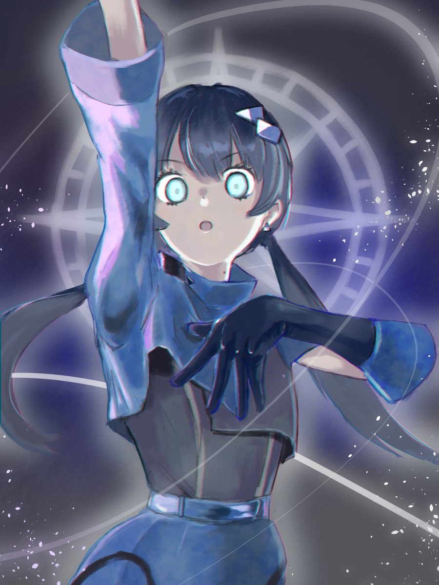 1girl :o asymmetrical_sleeves blue_eyes blue_hair blue_shirt blue_shorts commentary glowing glowing_eyes hashtag-only_commentary highres ladybug/beauty_(love_live!) light_particles link!_like!_love_live! long_hair long_sleeves looking_at_viewer love_live! low_twintails murano_sayaka official_alternate_costume open_mouth shirt short_sleeves shorts solo twintails uneven_sleeves upper_body v-shaped_eyebrows virtual_youtuber yulittlove