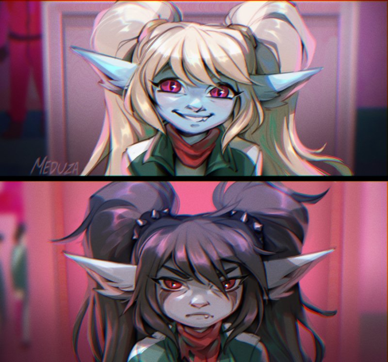 1girl artist_name black_hair blonde_hair blurry blurry_background colored_skin fang fang_out frown green_jacket grey_skin jacket league_of_legends meme noxus_poppy official_alternate_costume pink_eyes pointy_ears poppy_(league_of_legends) red_eyes smile spiked_hair_ornament squid_game te4moon teeth twintails year_1_&_year_2_(squid_game)_(meme) yordle
