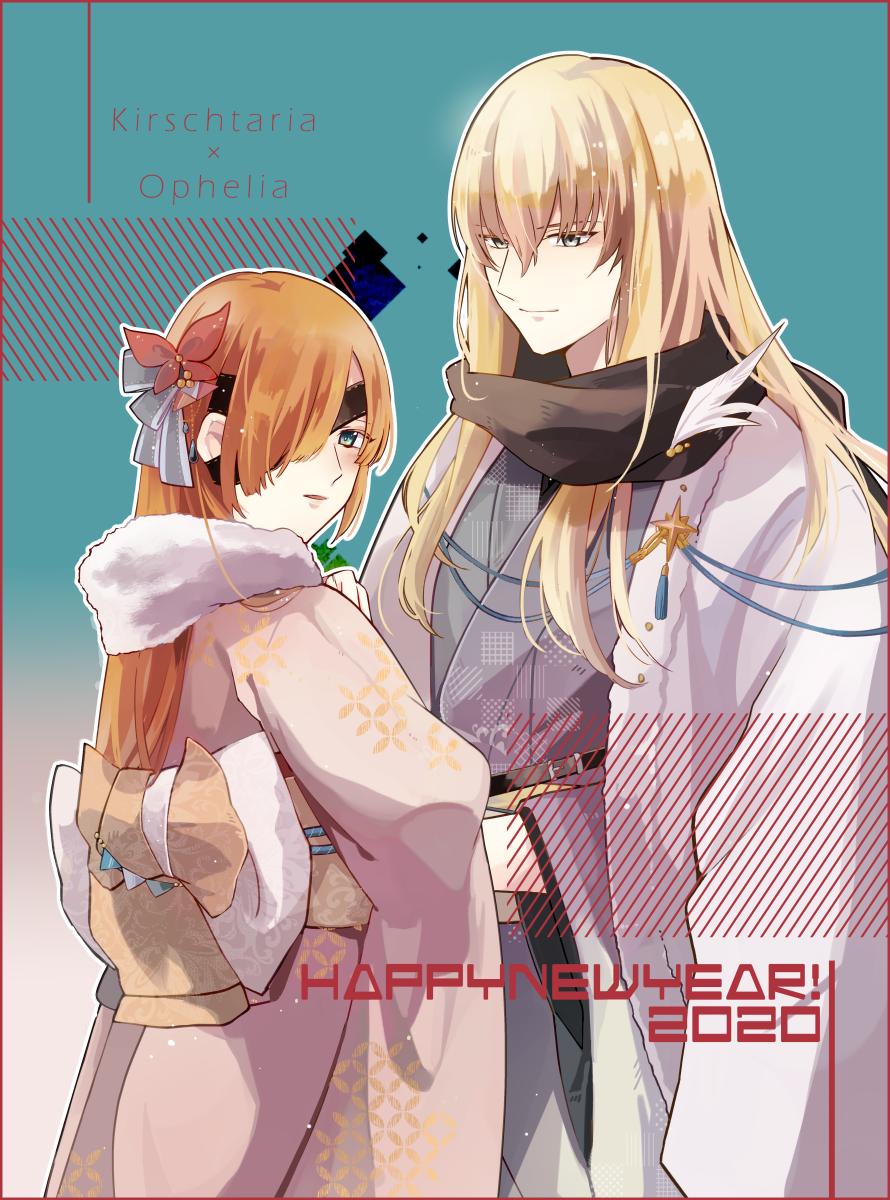 1boy 1girl 2020 alternate_costume black_scarf blonde_hair blue_eyes butterfly_hair_ornament character_name closed_mouth cowboy_shot english_text eyepatch fate/grand_order fate_(series) feathers fur_scarf grey_kimono grey_ribbon hair_between_eyes hair_ornament hair_over_one_eye hair_ribbon haori haori_on_shoulders happy_new_year highres japanese_clothes kimono kirschtaria_wodime light_blush long_hair long_sleeves looking_at_viewer new_year obi obijime ophelia_phamrsolone orange_hair outline parted_lips pink_kimono ribbon sash scarf smile sooru0720 star_(symbol) tassel white_feathers white_haori white_outline white_scarf wide_sleeves yellow_sash