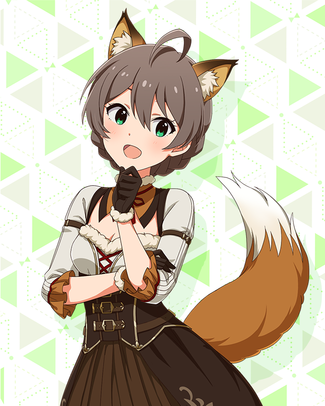 1girl :d ahoge animal_ear_fluff animal_ears blush bodice braid breasts brown_dress brown_gloves brown_hair cleavage clenched_hand detached_collar dirndl dot_nose dress eyelashes fake_animal_ears fox_ears fox_tail frilled_sleeves frills fur-trimmed_collar fur-trimmed_gloves fur_trim german_clothes gloves green_eyes hand_on_own_arm hand_on_own_chin head_tilt idolmaster idolmaster_million_live! idolmaster_million_live!_theater_days konkon_comfort_(idolmaster) medium_breasts neck_ribbon official_alternate_costume official_art open_mouth ribbon sakuramori_kaori shirt sleeveless sleeveless_dress three-quarter_sleeves smile solo tail triangle_background underbust white_shirt