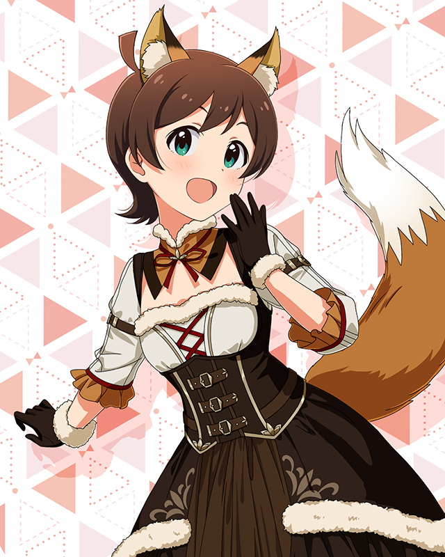 1girl :d ahoge animal_ear_fluff animal_ears blush bodice breasts brown_dress brown_gloves brown_hair detached_collar dirndl dot_nose dress fake_animal_ears flipped_hair fox_ears fox_tail frilled_sleeves frills fur-trimmed_collar fur-trimmed_gloves fur_trim german_clothes gloves green_eyes hand_up idolmaster idolmaster_million_live! idolmaster_million_live!_theater_days kinoshita_hinata konkon_comfort_(idolmaster) looking_at_viewer neck_ribbon official_alternate_costume official_art open_mouth ribbon shirt short_hair sidelocks sleeveless sleeveless_dress three-quarter_sleeves small_breasts smile solo tail triangle_background underbust white_shirt