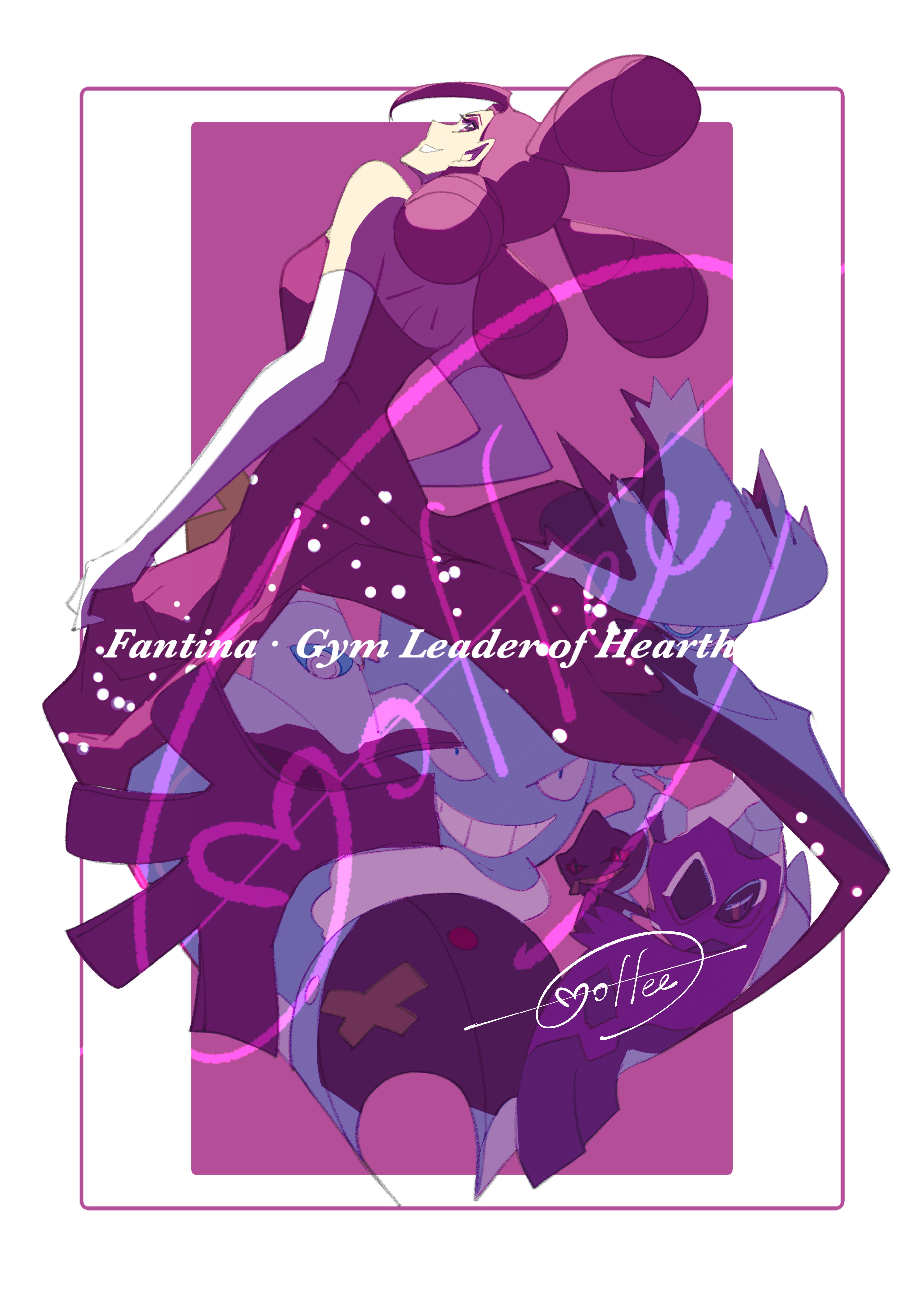 1girl absurdres border cccacademia character_name commentary_request dress drifblim dusknoir elbow_gloves fantina_(pokemon) froslass gen_1_pokemon gen_4_pokemon gengar gloves grin highres looking_back mismagius nintendo pokemon pokemon_(creature) pokemon_diamond/pearl/platinum purple_background purple_dress purple_hair quad_tails shoulder_blades signature sleeveless sleeveless_dress smile teeth white_border white_gloves