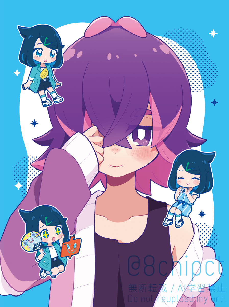0zr8hc 2girls bright_pupils cardigan chibi chibi_inset collarbone commentary crossed_bangs dot_(pokemon) gen_4_pokemon hand_up highres liko_(pokemon) looking_at_viewer multiple_girls nintendo open_cardigan open_clothes pokemon pokemon_(anime) pokemon_horizons purple_cardigan purple_eyes purple_hair rotom shirt short_hair sleeveless sleeveless_shirt untranslatable_commentary twitter_username watermark white_pupils