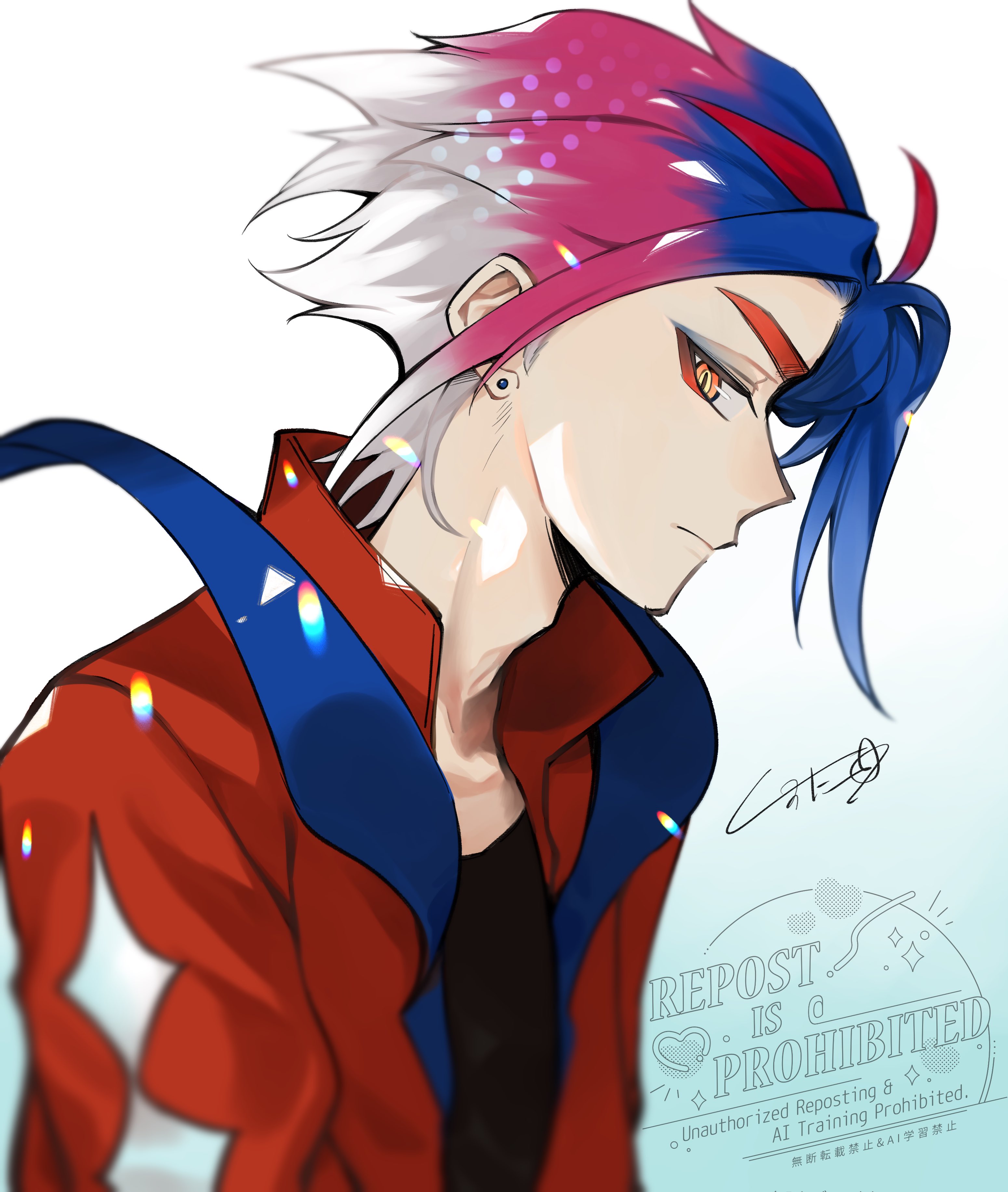1boy absurdres black_shirt blue_hair closed_mouth commentary_request earrings from_side gradient_background hei_tai_(kyaputen1) highres humanization jacket jewelry koraidon looking_to_the_side male_focus multicolored_hair nintendo orange_eyes pokemon purple_hair red_hair red_jacket shirt signature solo upper_body watermark white_hair