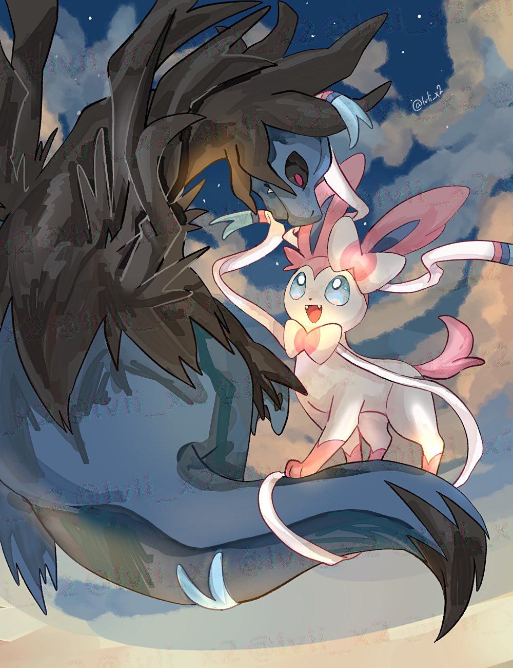 black_sclera bright_pupils cloud colored_sclera fangs floating gen_5_pokemon gen_6_pokemon highres hydreigon looking_down looking_up lvli_x2 nintendo no_humans open_mouth pokemon pokemon_(creature) red_eyes sky smile sylveon twitter_username white_pupils wings