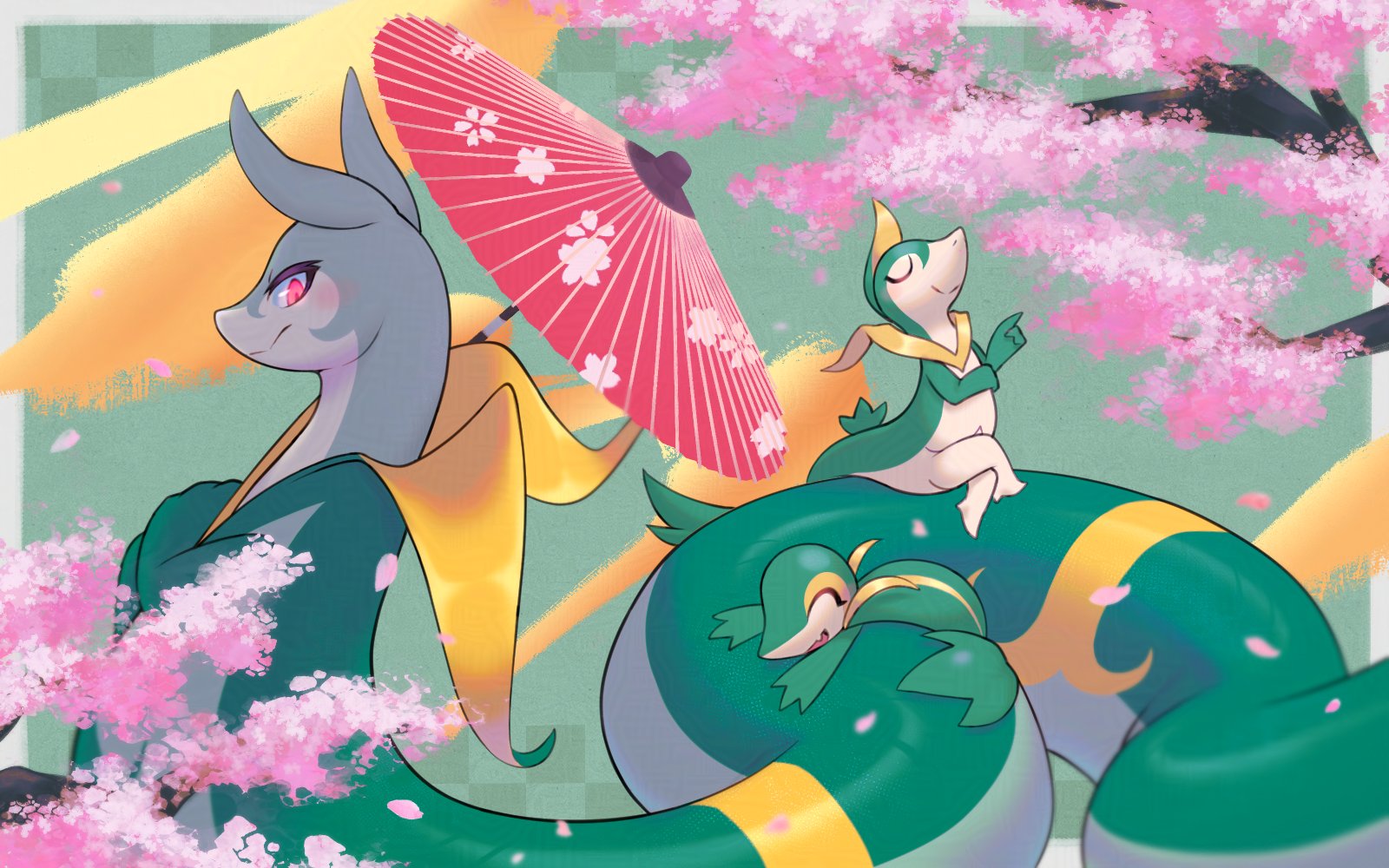 chinese_zodiac closed_eyes commentary english_commentary evolutionary_line fang gen_5_pokemon happy highres holding holding_umbrella nintendo no_humans petals pink_eyes pink_petals pointing pokemon pokemon_(creature) serperior servine sitting smile snivy tree tyltyll umbrella year_of_the_snake