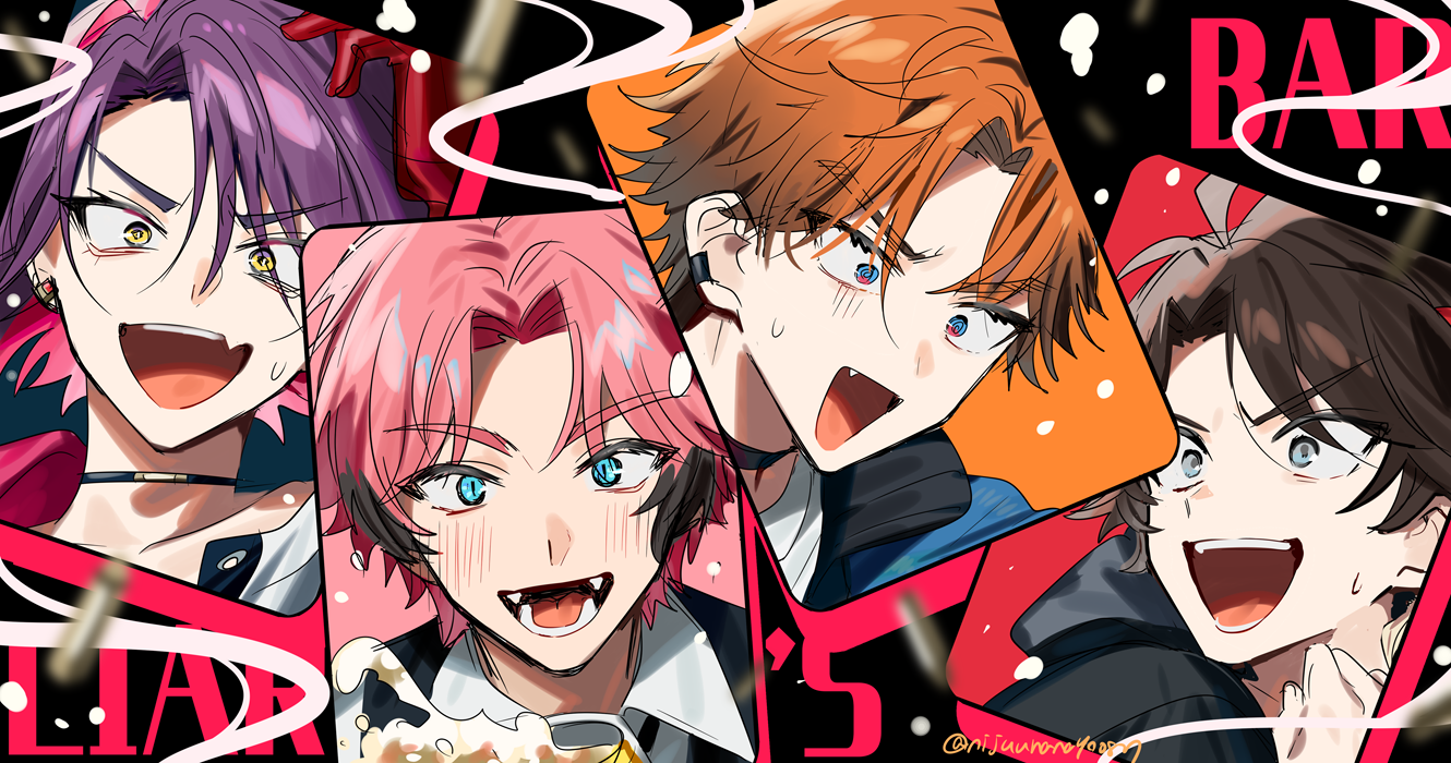 4boys :d @_@ akagi_wen akagi_wen_(2nd_costume) arm_up black_hair black_jacket blue_eyes blue_jacket brown_hair character_request check_character collared_shirt fang gloves grey_eyes jacket kitami_yusei kitami_yusei_(2nd_costume) male_focus multicolored_hair multiple_boys nijisanji ninahachi open_mouth parted_bangs pink_hair purple_hair red_gloves saiki_ittetsu shirt small_sweatdrop smile streaked_hair sweat thick_eyebrows usami_rito v-shaped_eyebrows virtual_youtuber watarai_hibari white_jacket white_shirt yellow_eyes