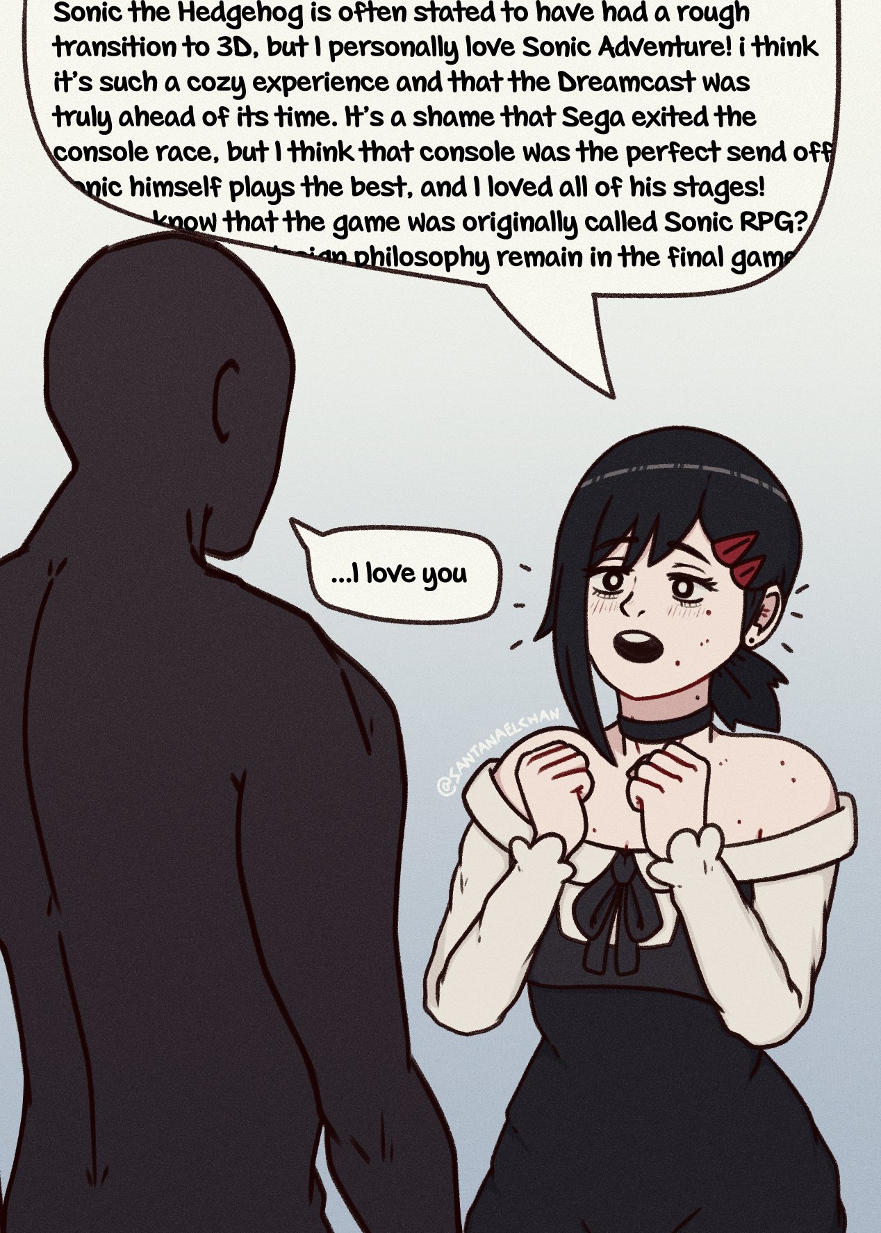 1boy 1girl bare_shoulders bow chainsaw_man choker commentary confession dress english_commentary faceless faceless_male freckles hair_ornament hairpin higashiyama_kobeni highres meme mole ponytail santanaelchan short_ponytail sonic_(series) speech_bubble tagme talking