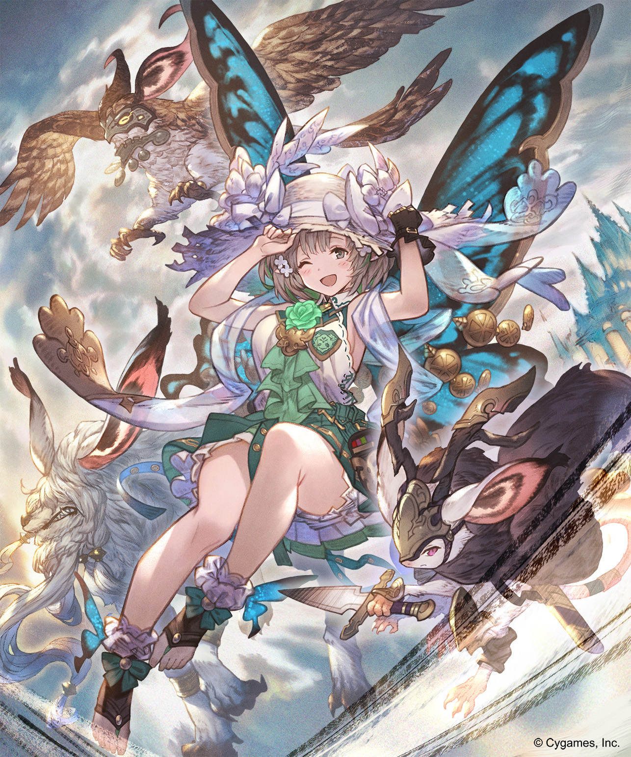 1girl animal bare_legs black_gloves breasts brown_eyes brown_hair commentary_request company_name day ezusuke fairy fairy_wings feet filly_(shadowverse) floating flower full_body gloves green_neckerchief green_skirt hair_flower hair_ornament hat highres holding holding_unworn_clothes holding_unworn_hat large_breasts looking_at_viewer neckerchief official_art one_eye_closed open_mouth outdoors shadowverse single_glove skirt smile solo sun_hat toeless_footwear toes unworn_hat unworn_headwear wing_collar wings