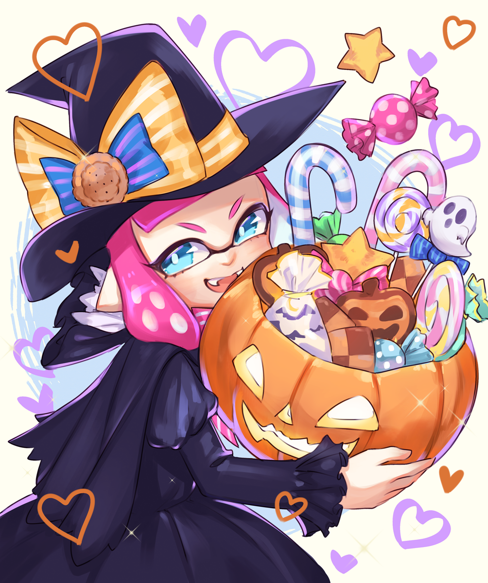 1girl black_cape black_dress black_hat blue_bow blue_eyes blunt_bangs bow bowtie bright_pupils bucket candy candy_cane candy_wrapper cape commentary_request cookie dress fangs food frilled_sleeves frills halloween halloween_bucket halloween_costume hat hat_bow hat_ribbon highres holding holding_bucket holding_halloween_bucket inkling inkling_girl inkling_player_character juliet_sleeves lollipop long_sleeves looking_at_viewer nintendo open_mouth pink_bow pink_bowtie pink_hair pointy_ears puffy_sleeves ribbon short_hair smile solo splatoon_(series) striped_bow striped_ribbon swirl_lollipop tentacle_hair upper_body v-shaped_eyebrows white_background white_pupils witch_hat yamagishi_chihiro yellow_bow yellow_ribbon