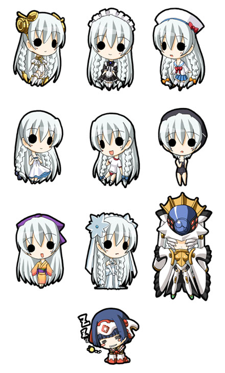 00s 2girls alternate_costume ar_tonelico ar_tonelico_i armor bow braid buruma chibi dress full_body gust gym_uniform hair_bow hair_ornament hat helmet japanese_clothes kimono long_hair mei_mei_(ar_tonelico) meimei_(ar_tonelico) mizuna_(water_emp-tei) multiple_girls one-piece_swimsuit school_swimsuit school_uniform serafuku shurelia_(ar_tonelico) standing swimsuit twin_braids wedding_dress white_hair yukata