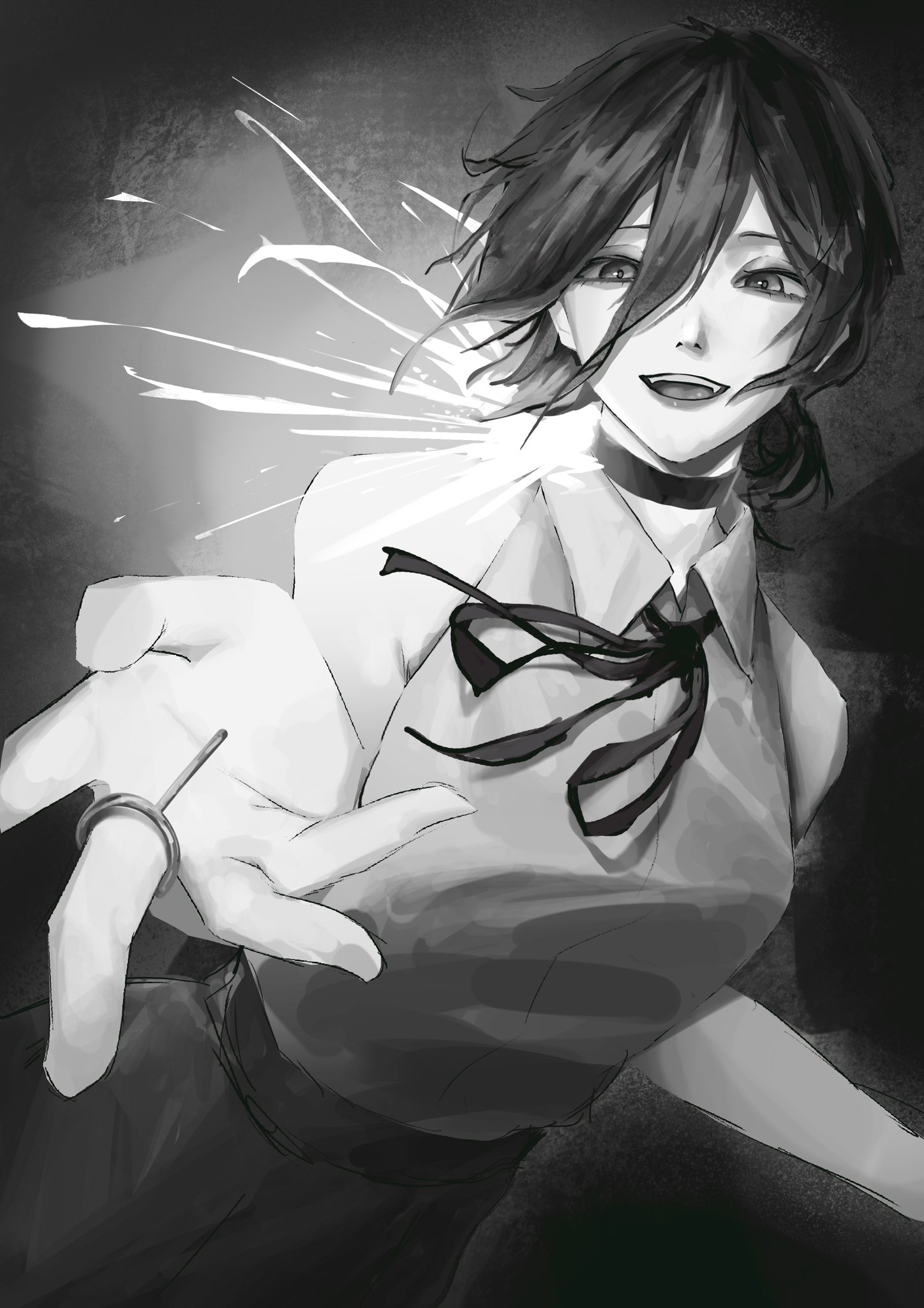 1girl chainsaw_man choker grenade_pin greyscale hair_between_eyes hair_bun highres monochrome neck_ribbon open_mouth reze_(chainsaw_man) ribbon shirt shorts sleeveless sleeveless_shirt solo sparks taorotana