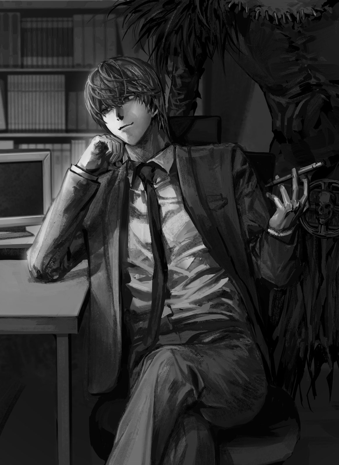 2boys black_necktie bookshelf chair collared_shirt computer crossed_legs death_note greyscale head_rest highres holding holding_pen jacket kinbakuoujii long_sleeves male_focus monochrome multiple_boys necktie on_chair pants pen ryuk shirt short_hair sitting smile solo_focus white_shirt yagami_light