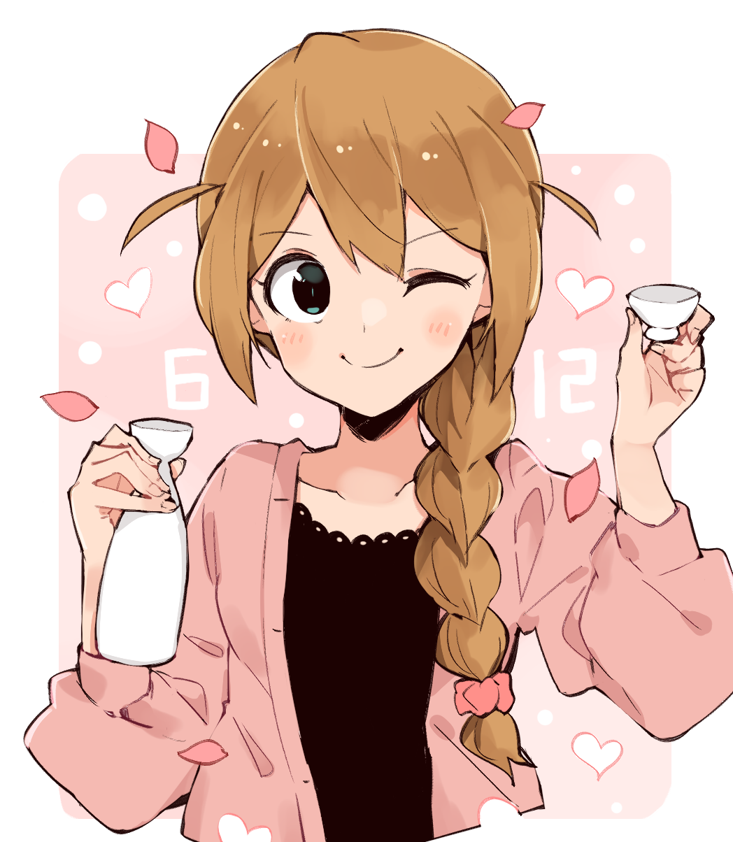 1girl baba_konomi blush_stickers bottle braid breasts brown_hair cardigan cherry_blossoms choko_(cup) closed_mouth cup dot_nose double-parted_bangs eyelashes falling_petals green_eyes hair_ribbon heart highres holding holding_bottle idolmaster idolmaster_million_live! idolmaster_million_live!_theater_days light_smile long_hair looking_at_viewer maverick_(muruchin) one_eye_closed open_cardigan open_clothes petals pink_cardigan ribbon sake_bottle sidelocks single_braid small_breasts solo upper_body