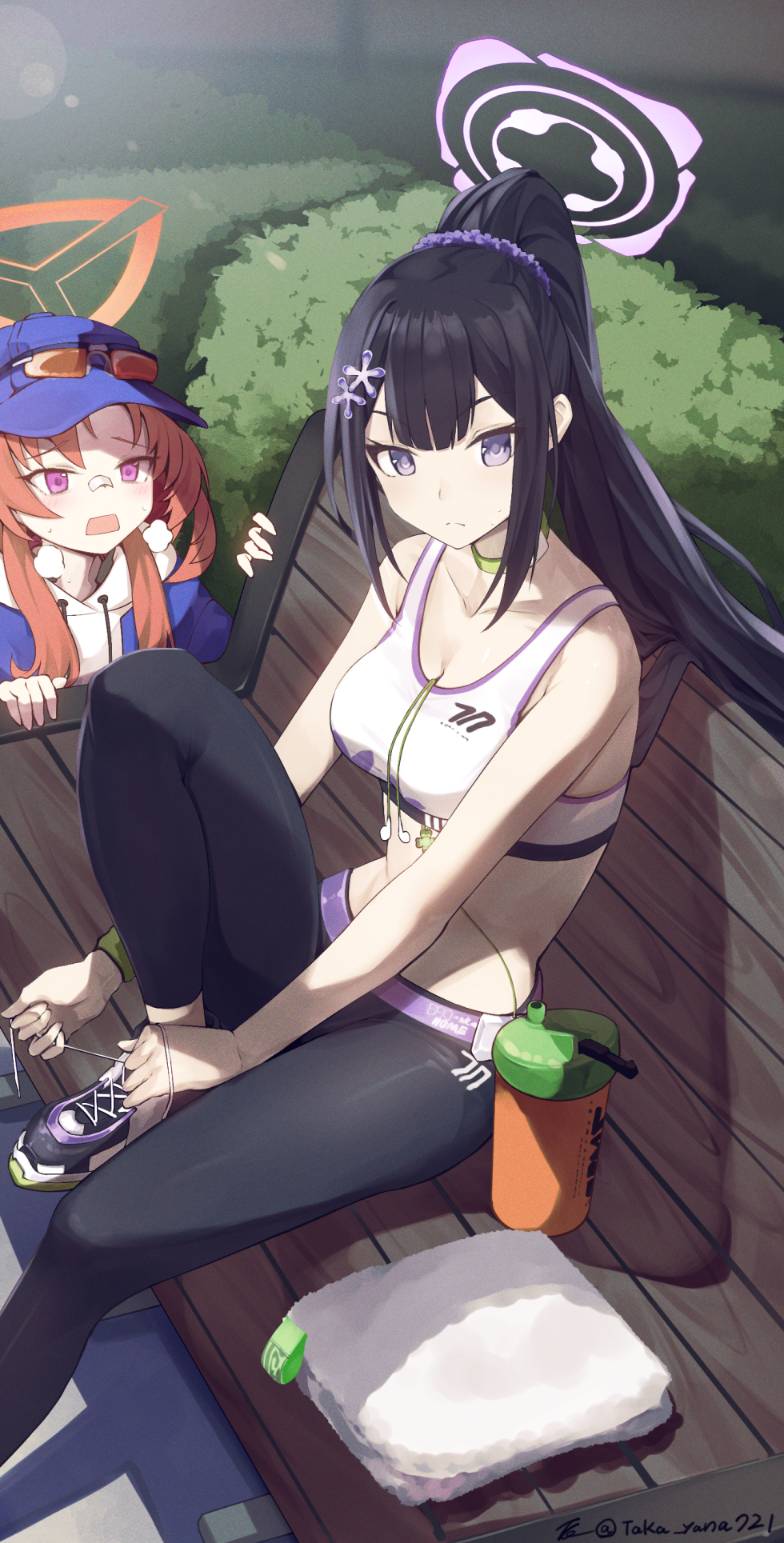 2girls bandaid bandaid_on_face bandaid_on_nose baseball_cap bench black_hair black_pants blue_archive blue_jacket bottle breasts choker eyewear_on_headwear green_choker halo hand_towel hat highres jacket long_hair long_sleeves multiple_girls navel orange_hair pants park_bench ponytail purple_eyes purple_scrunchie rei_(blue_archive) scrunchie sitting sports_bra sports_sunglasses standing standing_on_one_leg sumire_(blue_archive) sunglasses taka.yana tying_footwear water_bottle white_sports_bra yoga_pants