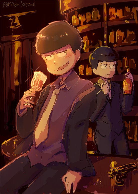 2boys alcohol alternate_costume antenna_hair bar_(place) black_eyes black_hair black_jacket black_pants black_suit blazer bottle brothers brown_hair closed_mouth collared_shirt cowboy_shot cup door drink drinking_glass formal_clothes frown gleam green_shirt gun half-closed_eyes hanada_hyou hand_on_own_chest hand_on_table handgun holding holding_bottle holding_drink indoors jacket light_blush long_sleeves looking_at_object looking_at_viewer male_focus matsuno_choromatsu matsuno_ichimatsu messy_hair multiple_boys necktie on_table one-hour_drawing_challenge open_clothes open_jacket open_mouth osomatsu-san osomatsu_(series) pants purple_shirt shirt short_hair siblings sitting smile suit table twitter_username v-neck vodka weapon white_necktie wine_glass