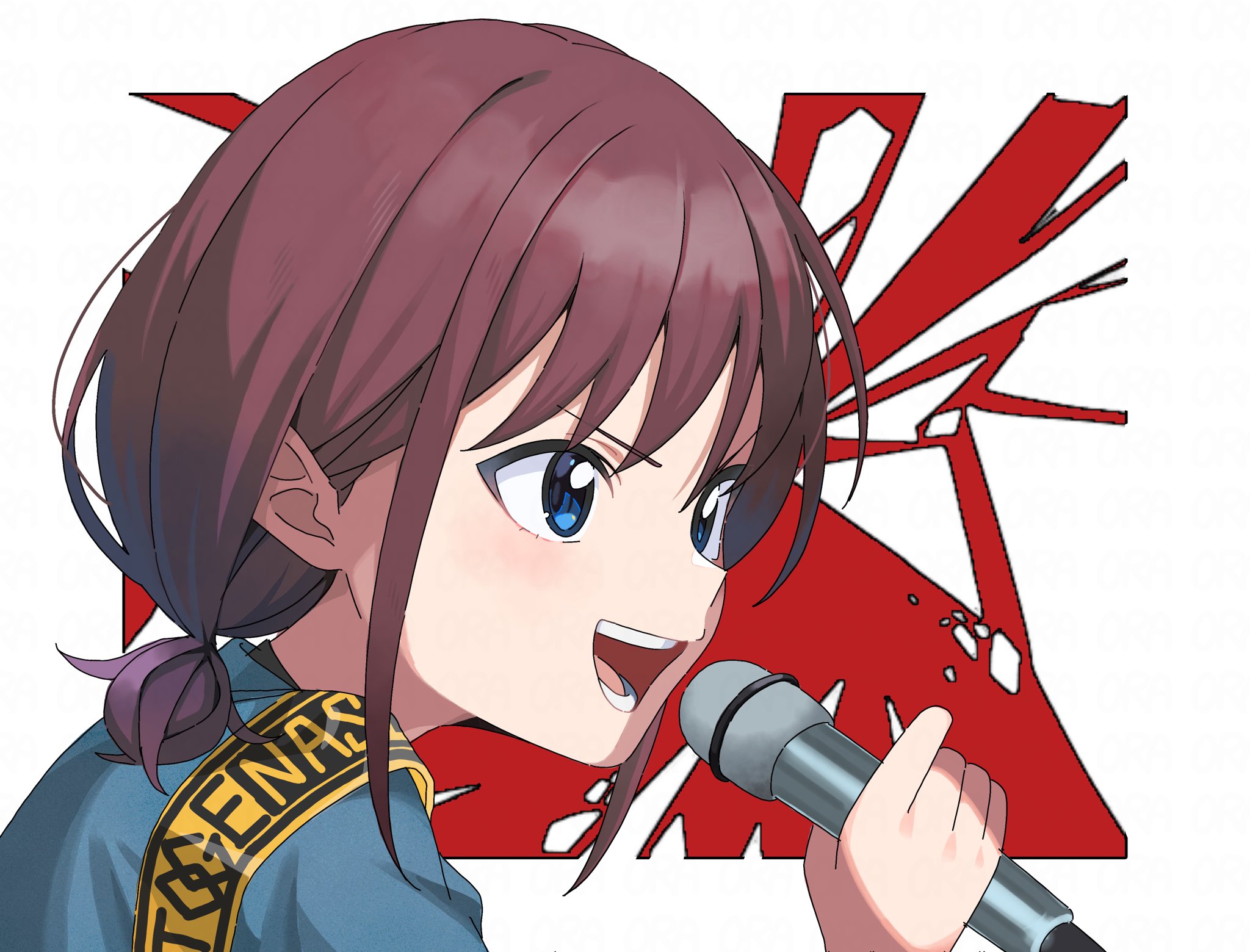 1girl blue_eyes brown_hair commentary_request girls_band_cry highres holding holding_microphone iseri_nina low_twintails microphone open_mouth ora_(oraora_oekaki) portrait short_hair short_twintails solo teeth twintails white_background
