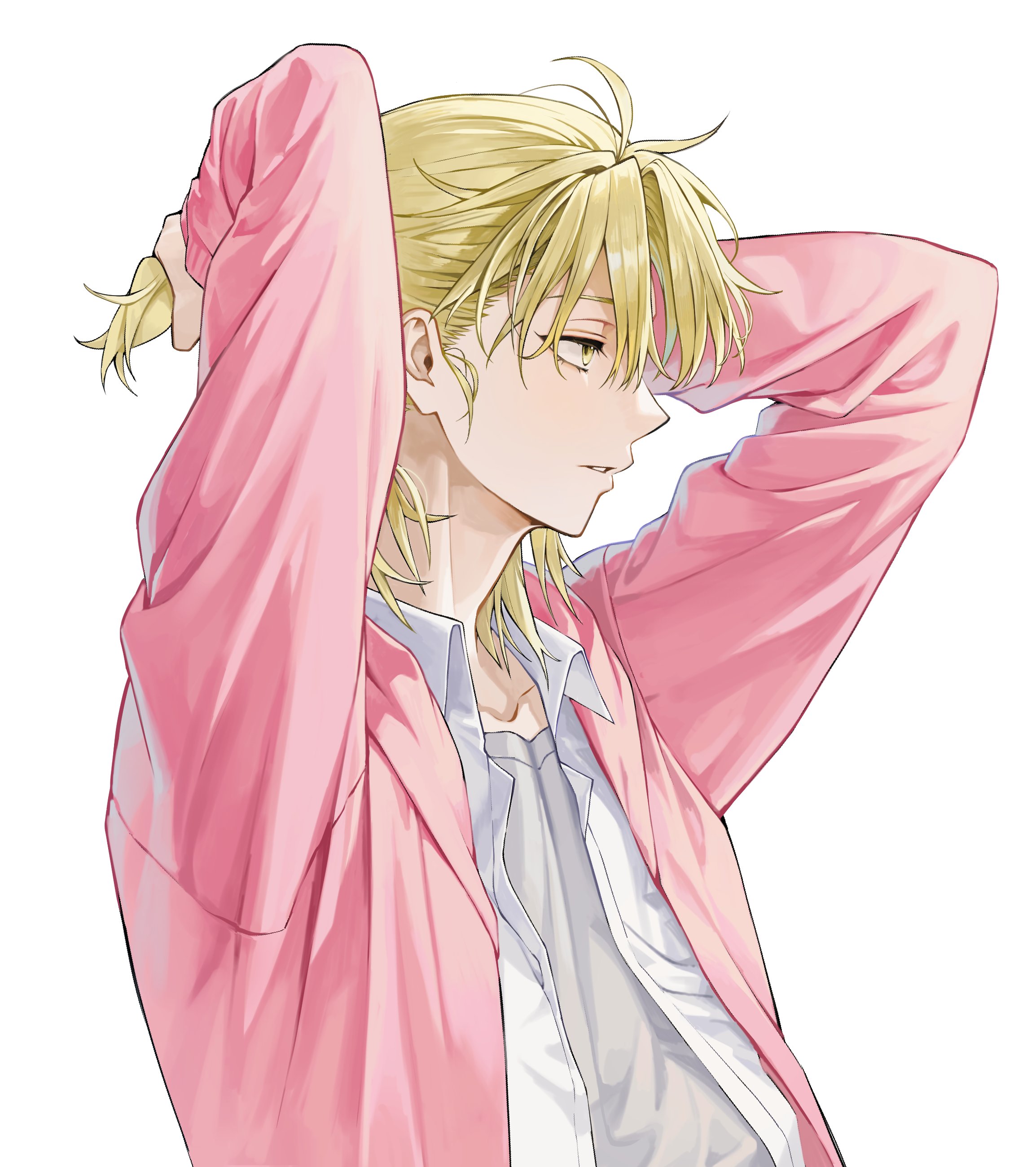 1boy 5_taku absurdres baek_eunyung blonde_hair coat collared_shirt expressionless from_side grey_shirt highres male_focus medium_hair no_home_(manhwa) open_clothes open_shirt parted_lips pink_coat shirt short_hair simple_background solo t-shirt teeth tying_hair white_background white_shirt yellow_eyes