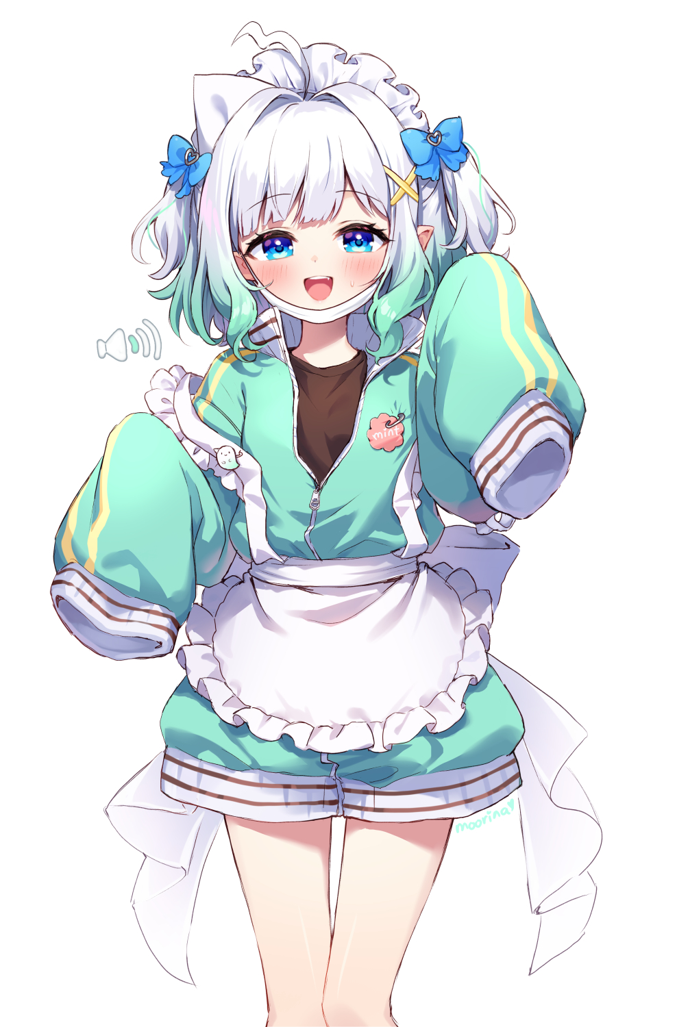 1girl ahoge apron artist_name back_bow black_shirt blue_eyes blush bow gradient_hair green_hair green_jacket hair_intakes hair_ornament highres indie_virtual_youtuber jacket long_sleeves looking_at_viewer maid_headdress mask medium_hair mint_fantome mint_fantome_(minto_2.0) moorina mouth_mask multicolored_hair open_mouth partially_open_jacket pointy_ears shirt simple_background sleeves_past_fingers sleeves_past_wrists smile solo strap_slip teeth triangular_headpiece two_side_up upper_teeth_only virtual_youtuber waist_apron white_apron white_background white_bow white_hair x_hair_ornament