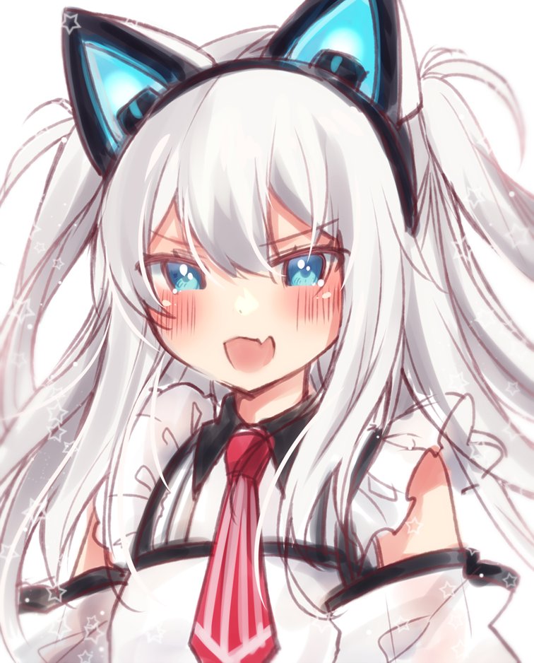 1girl :d animal_ears azur_lane blue_eyes blush cat_ears detached_sleeves dress fake_animal_ears fang frilled_dress frills hammann_(azur_lane) hammann_ii_(azur_lane) hayaman396 long_hair looking_at_viewer necktie open_mouth red_necktie simple_background sketch skin_fang smile solo two_side_up upper_body white_background white_dress white_hair